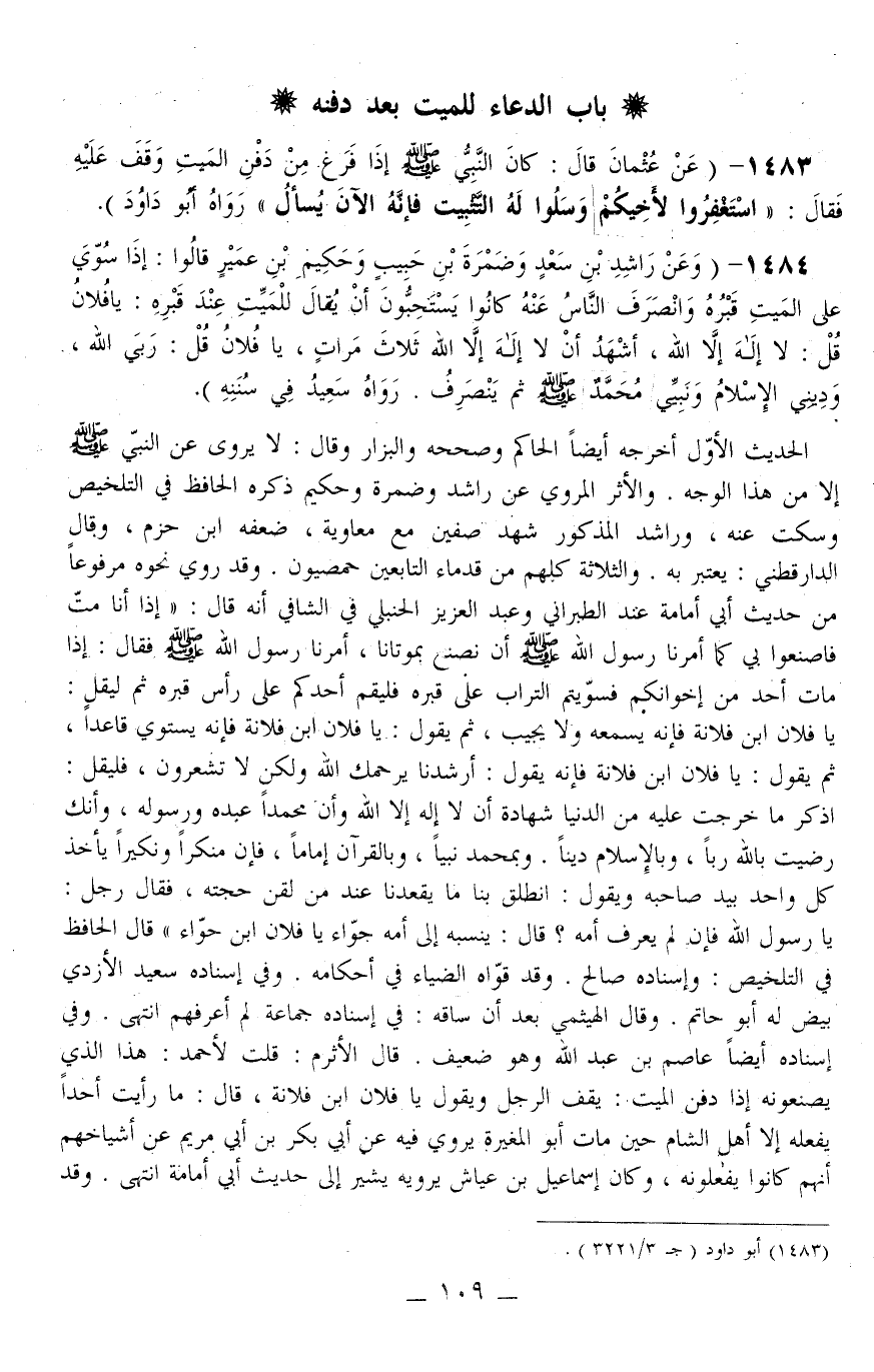 1483 - (عَنْ عُثْمَانَ قَالَ: «كَانَ النَّبِيُّ - صَلَّى اللَّهُ عَلَيْهِ وَسَلَّمَ - إذَا فَرَغَ مِنْ دَفْنِ الْمَيِّتِ وَقَفَ عَلَيْهِ فَقَالَ: اسْتَغْفِرُوا لِأَخِيكُمْ وَسَلُوا لَهُ التَّثْبِيتَ فَإِنَّهُ الْآنَ يُسْأَلُ» رَوَاهُ أَبُو دَاوُد)