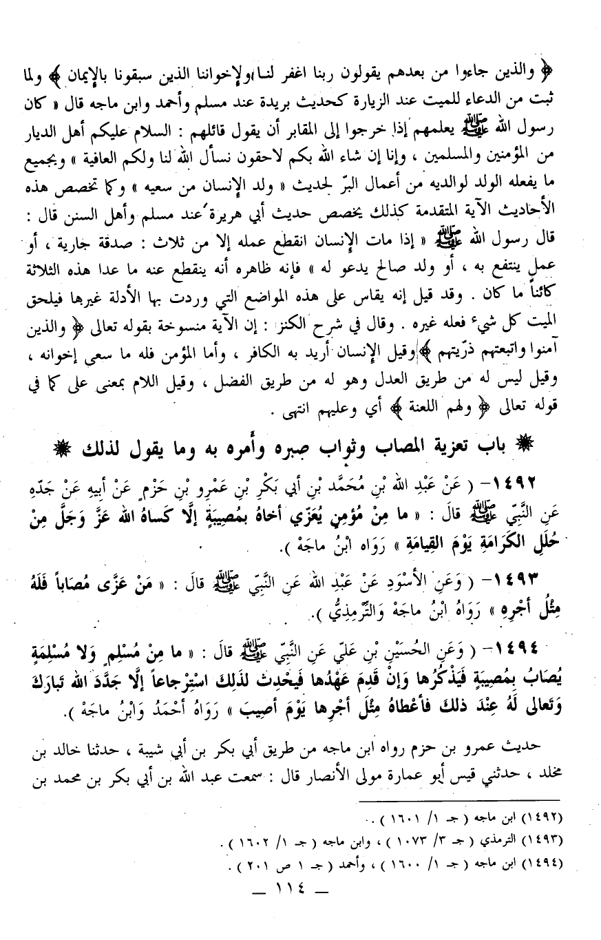 1492 - (عَنْ عَبْدِ اللَّهِ بْنِ مُحَمَّدِ بْنِ أَبِي بَكْرِ بْنِ عَمْرِو بْنِ حَزْمٍ عَنْ أَبِيهِ عَنْ جَدِّهِ عَنْ النَّبِيِّ - صَلَّى اللَّهُ عَلَيْهِ وَسَلَّمَ - قَالَ: «مَا مِنْ مُؤْمِنٍ يُعَزِّي أَخَاهُ بِمُصِيبَةٍ إلَّا كَسَاهُ اللَّهُ عَزَّ وَجَلَّ مِنْ حُلَلِ الْكَرَامَةِ يَوْمَ الْقِيَامَةِ» رَوَاهُ ابْنُ مَاجَهْ) .