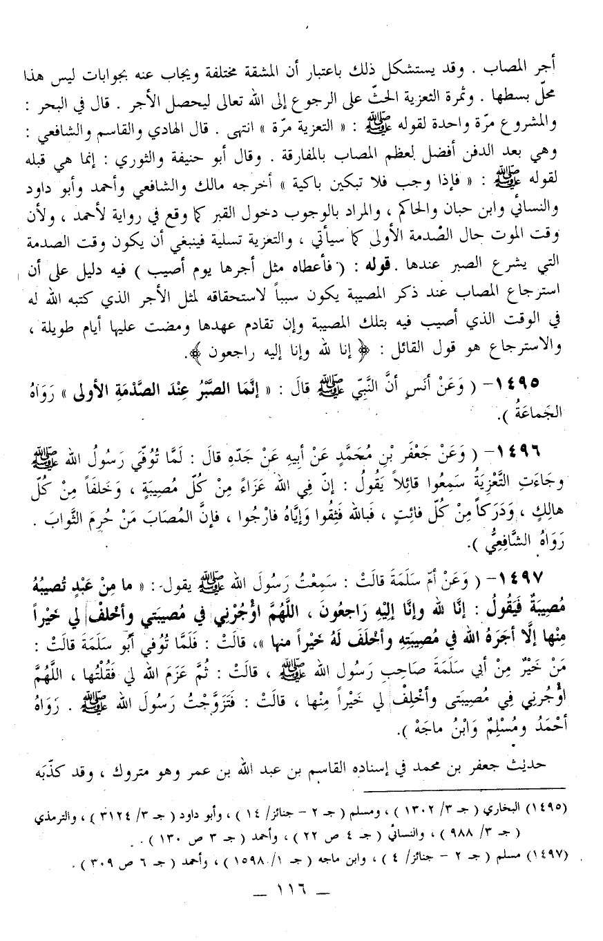 1497 - (وَعَنْ أُمِّ سَلَمَةَ قَالَتْ: سَمِعْت رَسُولَ اللَّهِ - صَلَّى اللَّهُ عَلَيْهِ وَسَلَّمَ - يَقُولُ: «مَا مِنْ عَبْدٍ تُصِيبُهُ مُصِيبَةٌ فَيَقُولُ: إنَّا لِلَّهِ وَإِنَّا إلَيْهِ رَاجِعُونَ، اللَّهُمَّ أْجُرْنِي فِي مُصِيبَتِي وَأَخْلِفْ لِي خَيْرًا مِنْهَا إلَّا أَجَرَهُ اللَّهُ فِي مُصِيبَتِهِ وَأَخْلَفَ لَهُ خَيْرًا مِنْهَا، قَالَتْ: فَلَمَّا تُوُفِّيَ أَبُو سَلَمَةَ قَالَتْ: مَنْ خَيْرٌ مِنْ أَبِي سَلَمَةَ صَاحِبِ رَسُولِ اللَّهِ - صَلَّى اللَّهُ عَلَيْهِ وَسَلَّمَ -، قَالَتْ: ثُمَّ عَزَمَ اللَّهُ لِي فَقُلْتُهَا، اللَّهُمَّ أْجُرْنِي فِي مُصِيبَتِي وَأَخْلِفْ لِي خَيْرًا مِنْهَا، قَالَتْ: فَتَزَوَّجْتُ رَسُولَ اللَّهِ - صَلَّى اللَّهُ عَلَيْهِ وَسَلَّمَ -» رَوَاهُ أَحْمَدُ وَمُسْلِمٌ وَابْنُ مَاجَهْ) .