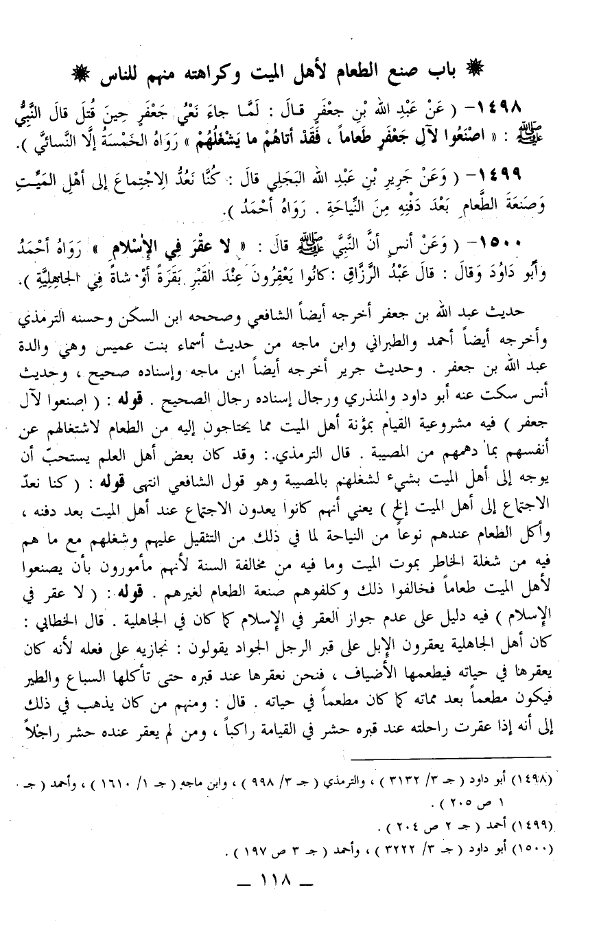1498 - (عَنْ عَبْدِ اللَّهِ بْنِ جَعْفَرٍ قَالَ: «لَمَّا جَاءَ نَعْيُ جَعْفَرٍ حِينَ قُتِلَ قَالَ النَّبِيُّ - صَلَّى اللَّهُ عَلَيْهِ وَسَلَّمَ -: اصْنَعُوا لِآلِ جَعْفَرٍ طَعَامًا، فَقَدْ أَتَاهُمْ مَا يَشْغَلُهُمْ» رَوَاهُ الْخَمْسَةُ إلَّا النَّسَائِيّ) .