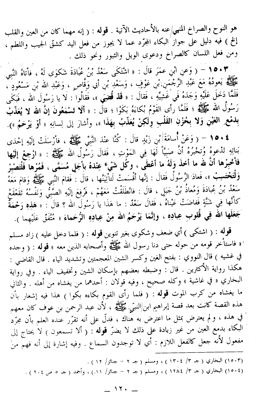 1503 - (وَعَنْ ابْنِ عُمَرَ قَالَ: «اشْتَكَى سَعْدُ بْنُ عُبَادَةَ شَكْوَى لَهُ، فَأَتَاهُ النَّبِيُّ - صَلَّى اللَّهُ عَلَيْهِ وَسَلَّمَ - يَعُودُهُ مَعَ عَبْدِ الرَّحْمَنِ بْنِ عَوْفٍ، وَسَعْدِ بْنِ أَبِي وَقَّاصٍ، وَعَبْدِ اللَّهِ بْنِ مَسْعُودٍ، فَلَمَّا دَخَلَ عَلَيْهِ وَجَدَهُ فِي غَشِيَّةٍ، فَقَالَ: قَدْ قَضَى فَقَالُوا: لَا يَا رَسُولَ اللَّهِ، فَبَكَى رَسُولُ اللَّهِ - صَلَّى اللَّهُ عَلَيْهِ وَسَلَّمَ - فَلَمَّا رَأَى الْقَوْمُ بُكَاءَهُ بَكَوْا؛ قَالَ: أَلَا تَسْمَعُونَ أَنَّ اللَّهَ لَا يُعَذِّبُ بِدَمْعِ الْعَيْنِ وَلَا بِحُزْنِ الْقَلْبِ وَلَكِنْ يُعَذِّبُ بِهَذَا، وَأَشَارَ إلَى لِسَانِهِ أَوْ يَرْحَمُ) » .
