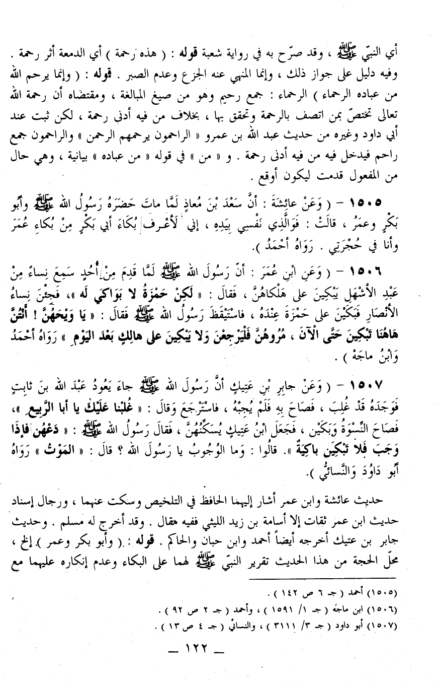 1506 - (وَعَنْ ابْنِ عُمَرَ: «أَنَّ رَسُولَ اللَّهِ - صَلَّى اللَّهُ عَلَيْهِ وَسَلَّمَ - لَمَّا قَدِمَ مِنْ أُحُدٍ سَمِعَ نِسَاءً مِنْ عَبْدِ الْأَشْهَلِ يَبْكِينَ عَلَى هَلْكَاهِنَّ، فَقَالَ: لَكِنْ حَمْزَةُ لَا بَوَاكِيَ لَهُ، فَجِئْنَ نِسَاءُ الْأَنْصَارِ فَبَكَيْنَ عَلَى حَمْزَةَ عِنْدَهُ، فَاسْتَيْقَظَ رَسُولُ اللَّهِ - صَلَّى اللَّهُ عَلَيْهِ وَسَلَّمَ - فَقَالَ: يَا وَيْحَهُنَّ أَنْتُنَّ هَاهُنَا تَبْكِينَ حَتَّى الْآنَ، مُرُوهُنَّ فَلْيَرْجِعْنَ وَلَا يَبْكِينَ عَلَى هَالِكٍ بَعْدَ الْيَوْمِ» رَوَاهُ أَحْمَدُ وَابْنُ مَاجَهْ) .