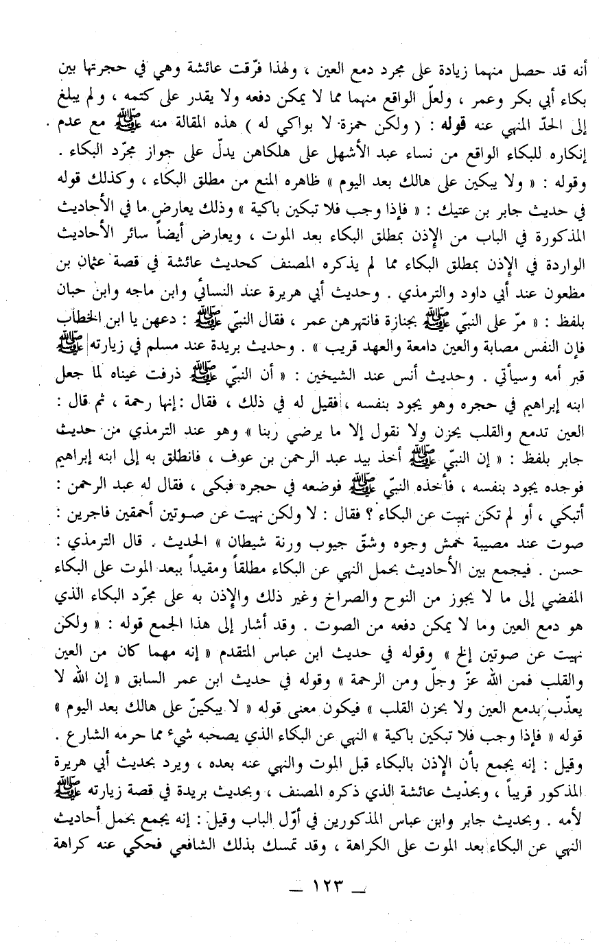 وَبِحَدِيثِ جَابِرٍ وَابْنِ عَبَّاسٍ الْمَذْكُورَيْنِ فِي أَوَّلِ الْبَابِ وَقِيلَ: إنَّهُ يُجْمَعُ بِحَمْلِ أَحَادِيثِ النَّهْيِ عَنْ الْبُكَاءِ بَعْدَ الْمَوْتِ عَلَى الْكَرَاهَةِ، وَقَدْ تَمَسَّكَ بِذَلِكَ الشَّافِعِيُّ فَحُكِيَ عَنْهُ كَرَاهَةُ