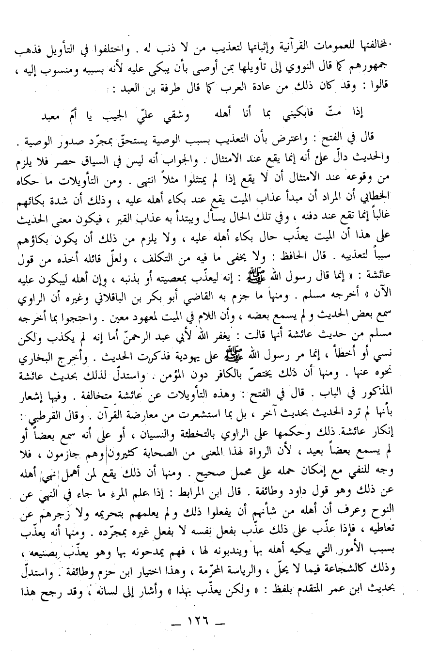 ـــــــــــــــــــــــــــــQلِمُخَالَفَتِهَا لِلْعُمُومَاتِ الْقُرْآنِيَّةِ وَإِثْبَاتِهَا لِتَعْذِيبِ مَنْ لَا ذَنْبَ لَهُ وَاخْتَلَفُوا فِي التَّأْوِيلِ فَذَهَبَ جُمْهُورُهُمْ كَمَا قَالَ النَّوَوِيُّ إلَى تَأْوِيلِهَا بِمَنْ أَوْصَى بِأَنْ يُبْكَى عَلَيْهِ؛ لِأَنَّهُ بِسَبَبِهِ وَمَنْسُوبٌ إلَيْهِ، قَالُوا: وَقَدْ كَانَ ذَلِكَ مِنْ عَادَةِ الْعَرَبِ كَمَا قَالَ طَرَفَةُ بْنُ الْعَبْدِ: