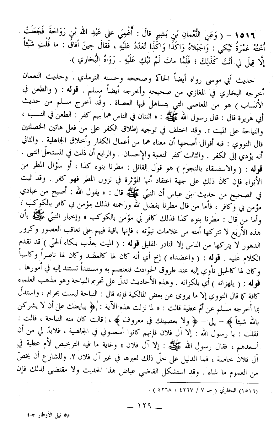 1516 - (وَعَنْ النُّعْمَانِ بْنِ بَشِيرٍ قَالَ: أُغْمِيَ عَلَى عَبْدِ اللَّهِ بْنِ رَوَاحَةَ فَجَعَلَتْ أُخْتُهُ عَمْرَةُ تَبْكِي: وَاجَبَلَاهُ وَاكَذَا وَاكَذَا تُعَدِّدُ عَلَيْهِ، فَقَالَ حِينَ أَفَاقَ: مَا قُلْت شَيْئًا إلَّا قِيلَ لِي أَنْتَ كَذَلِكَ؛ فَلَمَّا مَاتَ لَمْ تَبْكِ عَلَيْهِ رَوَاهُ الْبُخَارِيُّ)