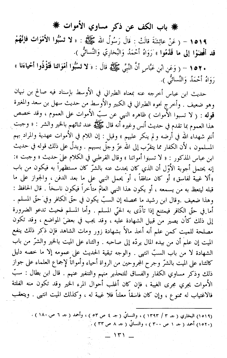 1519 - (عَنْ عَائِشَةَ قَالَتْ: قَالَ رَسُولُ اللَّهِ - صَلَّى اللَّهُ عَلَيْهِ وَسَلَّمَ -: «لَا تَسُبُّوا الْأَمْوَاتَ فَإِنَّهُمْ قَدْ أَفْضَوْا إلَى مَا قَدَّمُوا» رَوَاهُ أَحْمَدُ وَالْبُخَارِيُّ وَالنَّسَائِيُّ)
