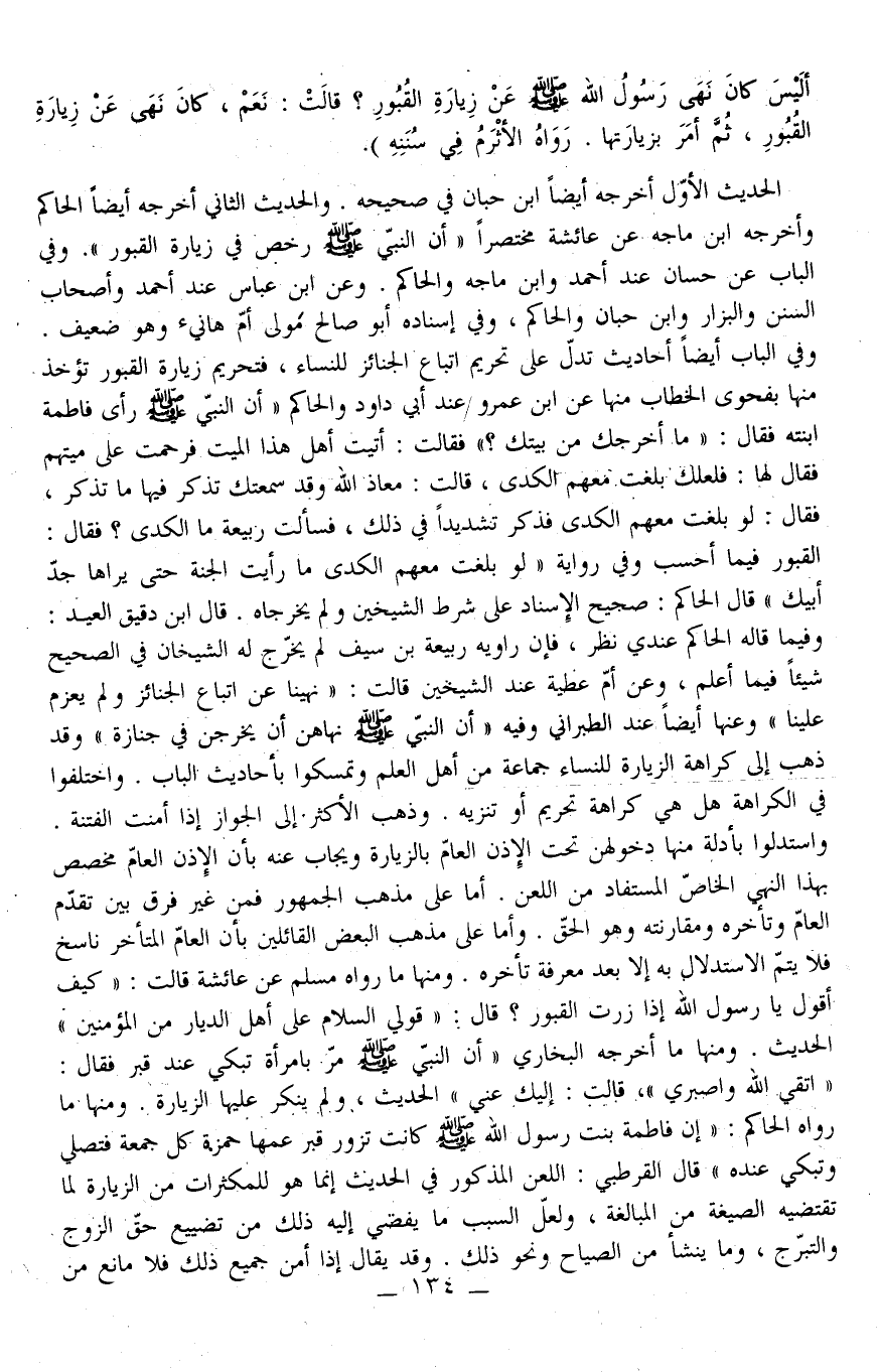 وَمِنْهَا مَا أَخْرَجَهُ الْبُخَارِيُّ «أَنَّ النَّبِيَّ - صَلَّى اللَّهُ عَلَيْهِ وَسَلَّمَ - مَرَّ بِامْرَأَةٍ تَبْكِي عِنْدَ قَبْرٍ فَقَالَ: اتَّقِي اللَّهَ وَاصْبِرِي، قَالَتْ: إلَيْك عَنِّي» الْحَدِيثَ، وَلَمْ يُنْكِرْ عَلَيْهَا الزِّيَارَةَ وَمِنْهَا مَا رَوَاهُ الْحَاكِمُ: " أَنَّ فَاطِمَةَ بِنْتَ رَسُولِ اللَّهِ - صَلَّى اللَّهُ عَلَيْهِ وَسَلَّمَ - كَانَتْ تَزُورُ قَبْرَ عَمِّهَا حَمْزَةَ كُلَّ جُمُعَةٍ فَتُصَلِّي وَتَبْكِي عِنْدَهُ " قَالَ الْقُرْطُبِيُّ: اللَّعْنُ الْمَذْكُورُ فِي الْحَدِيثِ إنَّمَا هُوَ لِلْمُكْثِرَاتِ مِنْ الزِّيَارَةِ لِمَا تَقْتَضِيهِ الصِّيغَةُ مِنْ الْمُبَالَغَةِ، وَلَعَلَّ السَّبَبَ مَا يَقْتَضِي إلَيْهِ ذَلِكَ مِنْ تَضْيِيعِ حَقِّ الزَّوْجِ وَالتَّبَرُّجِ، وَمَا يَنْشَأُ مِنْ الصِّيَاحِ وَنَحْوِ ذَلِكَ وَقَدْ يُقَالُ إذَا أَمِنَ جَمِيعَ ذَلِكَ فَلَا مَانِعَ مِنْ،