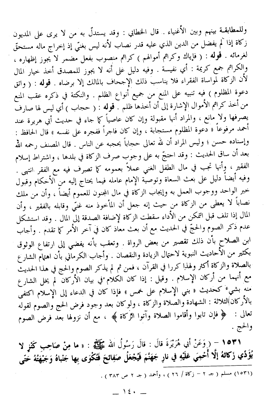 ـــــــــــــــــــــــــــــQوَلِلْمُطَابَقَةِ بَيْنَهُمْ وَبَيْنَ الْأَغْنِيَاءِ قَالَ الْخَطَّابِيِّ: وَقَدْ يَسْتَدِلُّ بِهِ مَنْ لَا يَرَى عَلَى الْمَدْيُونِ زَكَاةً إذَا لَمْ يَفْضُلْ مِنْ الدَّيْنِ الَّذِي عَلَيْهِ قَدْرُ نِصَابٍ؛ لِأَنَّهُ لَيْسَ بِغَنِيٍّ إذْ إخْرَاجُ مَالِهِ مُسْتَحَقٌّ لِغُرَمَائِهِ قَوْلُهُ: (فَإِيَّاكَ وَكَرَائِمَ أَمْوَالِهِمْ) كَرَائِمَ مَنْصُوبٌ بِفِعْلٍ مُضْمَرٍ لَا يَجُوزُ إظْهَارُهُ، وَالْكَرَائِمُ جَمْعُ كَرِيمَةٍ: أَيْ نَفِيسَةٍ.