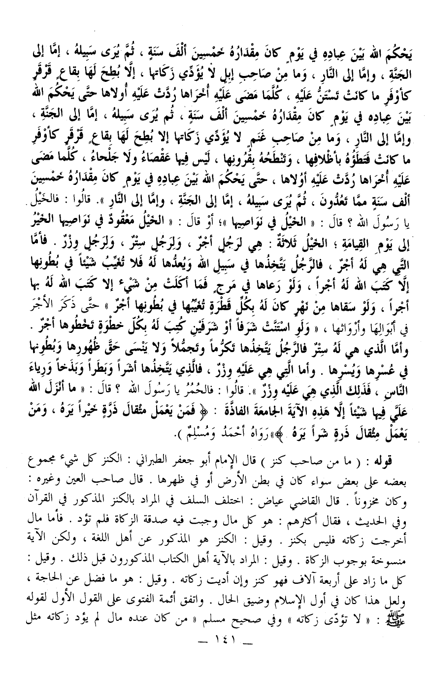يَحْكُمَ اللَّهُ بَيْنَ عِبَادِهِ فِي يَوْمٍ كَانَ مِقْدَارُهُ خَمْسِينَ أَلْفَ سَنَةٍ، ثُمَّ يُرَى سَبِيلُهُ، إمَّا إلَى الْجَنَّةِ، وَإِمَّا إلَى النَّارِ، وَمَا مِنْ صَاحِبِ إبِلٍ لَا يُؤَدِّي زَكَاتَهَا، إلَّا بُطِحَ لَهَا بِقَاعٍ قَرْقَرٍ كَأَوْفَرِ مَا كَانَتْ تَسْتَنُّ عَلَيْهِ، كُلَّمَا مَضَى عَلَيْهِ أُخْرَاهَا رُدَّتْ عَلَيْهِ أُولَاهَا حَتَّى يَحْكُمَ اللَّهُ بَيْنَ عِبَادِهِ فِي يَوْمٍ كَانَ مِقْدَارُهُ خَمْسِينَ أَلْفَ سَنَةٍ، ثُمَّ يُرَى سَبِيلُهُ، إمَّا إلَى الْجَنَّةِ، وَإِمَّا إلَى النَّارِ، وَمَا مِنْ صَاحِبِ غَنَمٍ لَا يُؤَدِّي زَكَاتَهَا إلَّا بُطِحَ لَهَا بِقَاعٍ قَرْقَرٍ كَأَوْفَرِ مَا كَانَتْ فَتَطَؤُهُ بِأَظْلَافِهَا، وَتَنْطَحُهُ بِقُرُونِهَا، لَيْسَ فِيهَا عَقْصَاءُ وَلَا جَلْحَاءُ، كُلَّمَا مَضَى عَلَيْهِ أُخْرَاهَا رُدَّتْ عَلَيْهِ أُولَاهَا، حَتَّى يَحْكُمَ اللَّهُ بَيْنَ عِبَادِهِ فِي يَوْمٍ كَانَ مِقْدَارُهُ خَمْسِينَ أَلْفَ سَنَةٍ مِمَّا تَعُدُّونَ، ثُمَّ يُرَى سَبِيلُهُ، إمَّا إلَى الْجَنَّةِ، وَإِمَّا إلَى النَّارِ قَالُوا: فَالْخَيْلُ يَا رَسُولَ اللَّهِ؟ قَالَ: الْخَيْلُ فِي نَوَاصِيهَا أَوْ قَالَ: الْخَيْلُ مَعْقُودٌ فِي نَوَاصِيهَا الْخَيْرُ إلَى يَوْمِ الْقِيَامَةِ؛ الْخَيْلُ ثَلَاثَةٌ: هِيَ لِرَجُلٍ أَجْرٌ، وَلِرَجُلٍ سِتْرٌ، وَلِرَجُلٍ وِزْرٌ فَأَمَّا الَّتِي هِيَ لَهُ أَجْرٌ، فَالرَّجُلُ يَتَّخِذُهَا فِي سَبِيلِ اللَّهِ وَيُعِدُّهَا لَهُ فَلَا تُغَيِّبُ شَيْئًا فِي بُطُونِهَا إلَّا كَتَبَ اللَّهُ لَهُ أَجْرًا، وَلَوْ رَعَاهَا فِي مَرْجٍ فَمَا أَكَلَتْ مِنْ شَيْءٍ إلَّا كَتَبَ اللَّهُ لَهُ بِهَا أَجْرًا، وَلَوْ سَقَاهَا مِنْ نَهْرٍ كَانَ لَهُ بِكُلِّ قَطْرَةٍ تُغَيِّبُهَا فِي بُطُونِهَا أَجْرٌ حَتَّى ذَكَرَ الْأَجْرَ فِي أَبْوَالِهَا وَأَرْوَاثِهَا، وَلَوْ اسْتَنَّتْ شَرَفًا أَوْ شَرَفَيْنِ كُتِبَ لَهُ بِكُلِّ خُطْوَةٍ تَخْطُوهَا أَجْرٌ. وَأَمَّا الَّذِي هِيَ لَهُ سِتْرٌ فَالرَّجُلُ يَتَّخِذُهَا تَكَرُّمًا وَتَجَمُّلًا وَلَا يَنْسَى حَقَّ ظُهُورِهَا وَبُطُونِهَا فِي عُسْرِهَا وَيُسْرِهَا وَأَمَّا الَّتِي هِيَ عَلَيْهِ وِزْرٌ، فَاَلَّذِي يَتَّخِذُهَا أَشَرًا وَبَطَرًا وَبَذَخًا وَرِيَاءَ النَّاسِ، فَذَلِكَ الَّذِي هِيَ عَلَيْهِ وِزْرٌ قَالُوا: فَالْحُمُرُ يَا رَسُولَ اللَّهِ؟ قَالَ: مَا أَنْزَلَ اللَّهُ عَلَيَّ فِيهَا شَيْئًا إلَّا هَذِهِ الْآيَةَ الْجَامِعَةَ الْفَاذَّةَ: {فَمَنْ يَعْمَلْ مِثْقَالَ ذَرَّةٍ خَيْرًا يَرَهُ} [الزلزلة: 7] {وَمَنْ يَعْمَلْ مِثْقَالَ ذَرَّةٍ شَرًّا يَرَهُ} [الزلزلة: 8] » رَوَاهُ أَحْمَدُ وَمُسْلِمٌ)