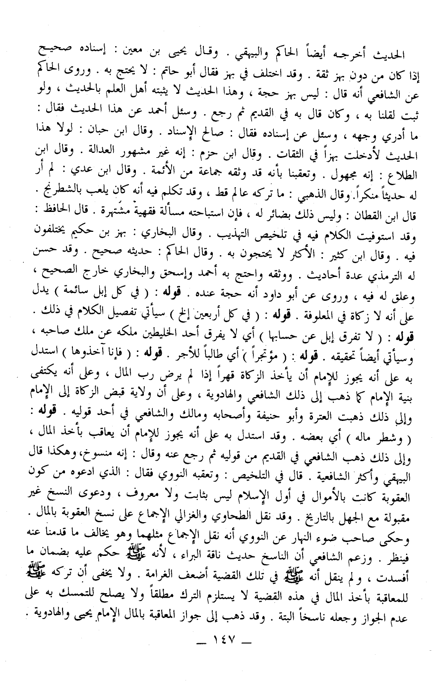 ـــــــــــــــــــــــــــــQالْحَدِيثُ أَخْرَجَهُ أَيْضًا الْحَاكِمُ وَالْبَيْهَقِيُّ. وَقَالَ يَحْيَى بْنُ مَعِينٍ: إسْنَادُهُ صَحِيحٌ إذَا كَانَ مِنْ دُونِ بَهْزٍ ثِقَةٌ وَقَدْ اُخْتُلِفَ فِي بَهْزٍ فَقَالَ أَبُو حَاتِمٍ: لَا يُحْتَجُّ بِهِ وَرَوَى الْحَاكِمُ عَنْ الشَّافِعِيِّ أَنَّهُ قَالَ: لَيْسَ بَهْزٌ حُجَّةً، وَهَذَا الْحَدِيثُ لَا يُثْبِتُهُ أَهْلُ الْعِلْمِ بِالْحَدِيثِ، وَلَوْ ثَبَتَ لَقُلْنَا بِهِ، وَكَانَ قَالَ بِهِ فِي الْقَدِيمِ ثُمَّ رَجَعَ وَسُئِلَ أَحْمَدُ عَنْ هَذَا الْحَدِيثِ فَقَالَ: مَا أَدْرِي وَجْهَهُ، وَسُئِلَ عَنْ إسْنَادِهِ فَقَالَ: صَالِحُ الْإِسْنَادِ وَقَالَ ابْنُ حِبَّانَ: لَوْلَا هَذَا الْحَدِيثُ لَأَدْخَلْتُ بَهْزًا فِي الثِّقَاتِ وَقَالَ ابْنُ حَزْمٍ: إنَّهُ غَيْرُ مَشْهُورِ الْعَدَالَةِ وَقَالَ ابْنُ الطَّلَّاعِ: إنَّهُ مَجْهُولٌ وَتَعَقَّبْنَا بِأَنَّهُ قَدْ وَثَّقَهُ جَمَاعَةٌ مِنْ الْأَئِمَّةِ وَقَالَ ابْنُ عَدِيٍّ: لَمْ أَرَ لَهُ حَدِيثًا مُنْكَرًا وَقَالَ الذَّهَبِيُّ: مَا تَرَكَهُ عَالَمٌ قَطُّ، وَقَدْ تَكَلَّمَ فِيهِ أَنَّهُ كَانَ يَلْعَبُ بِالشِّطْرَنْجِ قَالَ ابْنُ الْقَطَّانِ: وَلَيْسَ ذَلِكَ بِضَائِرٍ لَهُ، فَإِنَّ اسْتِبَاحَتَهُ مَسْأَلَةٌ فِقْهِيَّةٌ مُشْتَهِرَةٌ قَالَ الْحَافِظُ: وَقَدْ اسْتَوْفَيْتُ الْكَلَامَ فِيهِ فِي تَلْخِيصِ التَّهْذِيبِ وَقَالَ الْبُخَارِيُّ: بَهْزُ بْنُ حَكِيمٍ يَخْتَلِفُونَ فِيهِ وَقَالَ ابْنُ كَثِيرٍ: الْأَكْثَرُ لَا يَحْتَجُّونَ بِهِ وَقَالَ الْحَاكِمُ: حَدِيثُهُ صَحِيحٌ وَقَدْ حَسَّنَ لَهُ التِّرْمِذِيُّ عِدَّةَ أَحَادِيثَ وَوَثَّقَهُ وَاحْتَجَّ بِهِ أَحْمَدُ وَإِسْحَاقُ وَالْبُخَارِيُّ خَارِجَ الصَّحِيحِ، وَعَلَّقَ لَهُ فِيهِ، وَرَوَى عَنْ أَبِي دَاوُد أَنَّهُ حُجَّةٌ عِنْدَهُ قَوْلَهُ: «فِي كُلِّ إبِلٍ سَائِمَةٍ» يَدُلُّ عَلَى أَنَّهُ لَا زَكَاةَ فِي الْمَعْلُوفَةِ قَوْلُهُ: (فِي كُلِّ أَرْبَعِينَ. . . إلَخْ) سَيَأْتِي تَفْصِيلُ الْكَلَامِ فِي ذَلِكَ قَوْلَهُ: (لَا تُفْرَقُ إبِلٌ عَنْ حِسَابِهَا) أَيْ لَا يُفَرِّقُ أَحَدُ الْخَلِيطَيْنِ مِلْكَهُ عَنْ مِلْكِ صَاحِبِهِ، وَسَيَأْتِي أَيْضًا تَحْقِيقُهُ