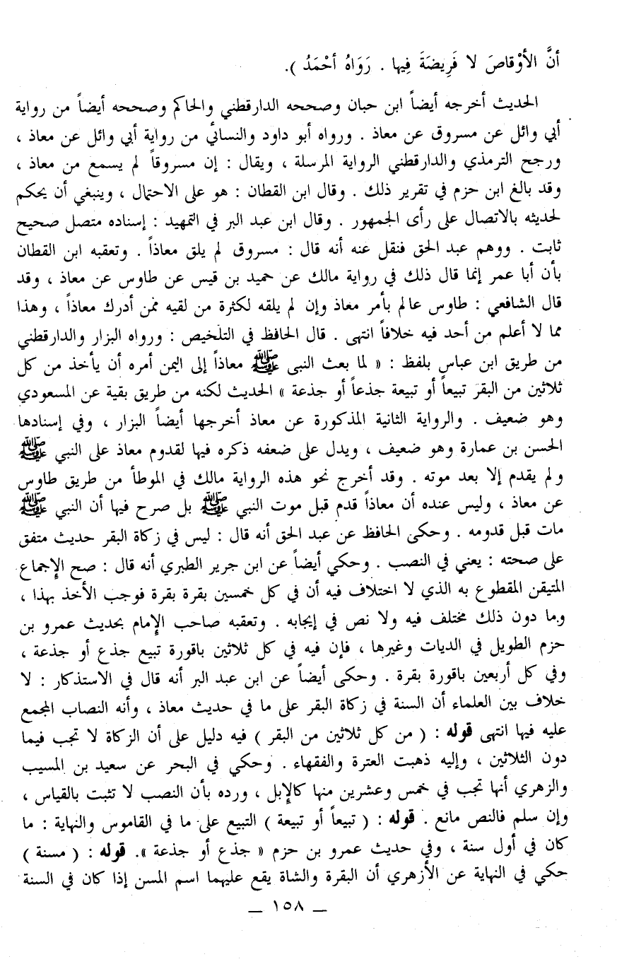 وَقَالَ ابْنُ عَبْدِ الْبَرِّ فِي التَّمْهِيدِ: إسْنَادُهُ مُتَّصِلٌ صَحِيحٌ ثَابِتٌ. وَوَهِمَ عَبْدُ الْحَقِّ فَنُقِلَ عَنْهُ أَنَّهُ قَالَ: مَسْرُوقٌ لَمْ يَلْقَ مُعَاذًا وَتَعَقَّبَهُ ابْنُ الْقَطَّانِ بِأَنَّ أَبَا عُمَرَ إنَّمَا قَالَ ذَلِكَ رِوَايَةُ مَالِكٍ عَنْ حُمَيْدٍ بْنِ قَيْسٍ عَنْ طَاوُسٍ عَنْ مُعَاذٍ، وَقَدْ قَالَ الشَّافِعِيُّ: طَاوُسٌ عَالِمٌ بِأَمْرِ مُعَاذٍ وَإِنْ لَمْ يَلْقَهُ لِكَثْرَةِ مَنْ لَقِيَهُ مِمَّنْ أَدْرَكَ مُعَاذًا، وَهَذَا مِمَّا لَا أَعْلَمُ مِنْ أَحَدٍ فِيهِ خِلَافًا انْتَهَى. قَالَ الْحَافِظُ فِي التَّلْخِيصِ: وَرَوَاهُ الْبَزَّارُ وَالدَّارَقُطْنِيّ مِنْ طَرِيقِ ابْنِ عَبَّاسٍ بِلَفْظِ: «لَمَّا بَعَثَ النَّبِيُّ - صَلَّى اللَّهُ عَلَيْهِ وَسَلَّمَ - مُعَاذًا إلَى الْيَمَنِ أَمَرَهُ أَنْ يَأْخُذَ مِنْ كُلِّ ثَلَاثِينَ مِنْ الْبَقَرِ تَبِيعًا أَوْ تَبِيعَةً جَذَعًا أَوْ جَذَعَةً» الْحَدِيثَ لَكِنَّهُ مِنْ طَرِيقِ بَقِيَّةَ عَنْ الْمَسْعُودِيِّ وَهُوَ ضَعِيفٌ وَالرِّوَايَةُ الثَّانِيَةُ الْمَذْكُورَةُ عَنْ مُعَاذٍ أَخْرَجَهَا أَيْضًا الْبَزَّارُ، وَفِي إسْنَادِهَا الْحَسَنُ بْنُ عُمَارَةَ وَهُوَ ضَعِيفٌ، وَيَدُلُّ عَلَى ضَعْفِهِ ذِكْرُهُ فِيهَا لِقُدُومِ مُعَاذٍ عَلَى النَّبِيِّ - صَلَّى اللَّهُ عَلَيْهِ وَسَلَّمَ - وَلَمْ يَقْدَمْ إلَّا بَعْدَ مَوْتِهِ وَقَدْ أَخْرَجَ نَحْوَ هَذِهِ الرِّوَايَةِ مَالِكٌ فِي الْمُوَطَّأِ مِنْ طَرِيقِ طَاوُسٍ عَنْ مُعَاذٍ، وَلَيْسَ عِنْدَهُ أَنَّ مُعَاذًا قَدِمَ قَبْلَ مَوْتِ النَّبِيِّ - صَلَّى اللَّهُ عَلَيْهِ وَسَلَّمَ - بَلْ صَرَّحَ فِيهَا أَنَّ النَّبِيَّ - صَلَّى اللَّهُ عَلَيْهِ وَسَلَّمَ - مَاتَ قَبْلَ قُدُومِهِ وَحَكَى الْحَافِظُ عَنْ عَبْدِ الْحَقِّ أَنَّهُ قَالَ: لَيْسَ فِي زَكَاةِ الْبَقَرِ حَدِيثٌ مُتَّفَقٌ عَلَى صِحَّتِهِ: يَعْنِي فِي النُّصُبِ وَحَكَى أَيْضًا عَنْ ابْنِ جَرِيرٍ الطَّبَرِيِّ أَنَّهُ قَالَ: صَحَّ الْإِجْمَاعُ الْمُتَيَقَّنُ الْمَقْطُوعُ بِهِ الَّذِي لَا اخْتِلَافَ فِيهِ أَنَّ فِي كُلِّ خَمْسِينَ بَقَرَةً بَقَرَةً فَوَجَبَ الْأَخْذُ بِهَذَا.