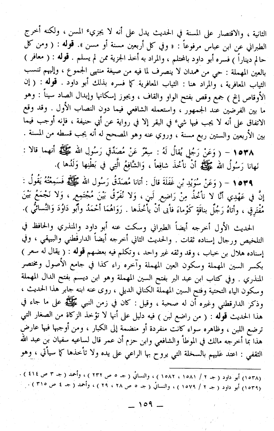 وَالْمُرَادُ بِهِ أَخْذُ الْجِزْيَةِ مِمَّنْ لَمْ يُسْلِمْ قَوْلُهُ: (مَعَافِرَ) بِالْعَيْنِ الْمُهْمَلَةِ: حَيٌّ مِنْ هَمْدَانَ لَا يَنْصَرِفُ لِمَا فِيهِ مِنْ صِيغَةِ مُنْتَهَى الْجُمُوعِ، وَإِلَيْهِمْ تُنْسَبُ الثِّيَابُ الْمَعَافِرِيَّةُ، وَالْمُرَادُ هُنَا: الثِّيَابُ الْمَعَافِرِيَّةُ، كَمَا فَسَّرَهُ بِذَلِكَ أَبُو دَاوُد قَوْلُهُ: (إنَّ الْأَوْقَاصَ. . . إلَخْ) جَمْعُ وَقَصٍ بِفَتْحِ الْوَاوِ وَالْقَافِ، وَيَجُوزُ إسْكَانُهَا وَإِبْدَالُ الصَّادِ سِينًا: وَهُوَ مَا بَيْنَ الْفَرْضَيْنِ عِنْدَ الْجُمْهُورِ، وَاسْتَعْمَلَهُ الشَّافِعِيُّ فِيمَا دُونَ النِّصَابِ الْأَوَّلِ وَقَدْ وَقَعَ الِاتِّفَاقُ عَلَى أَنَّهُ لَا يَجِبُ فِيهَا شَيْءٌ فِي الْبَقَرِ إلَّا فِي رِوَايَةٍ عَنْ أَبِي حَنِيفَةَ، فَإِنَّهُ أَوْجَبَ فِيمَا بَيْنَ الْأَرْبَعِينَ وَالسِّتِّينَ رُبْعَ مُسِنَّةٍ، وَرُوِيَ عَنْهُ وَهُوَ الْمُصَحِّحُ لَهُ أَنَّهُ يَجِبُ قِسْطُهُ مِنْ الْمُسِنَّةِ