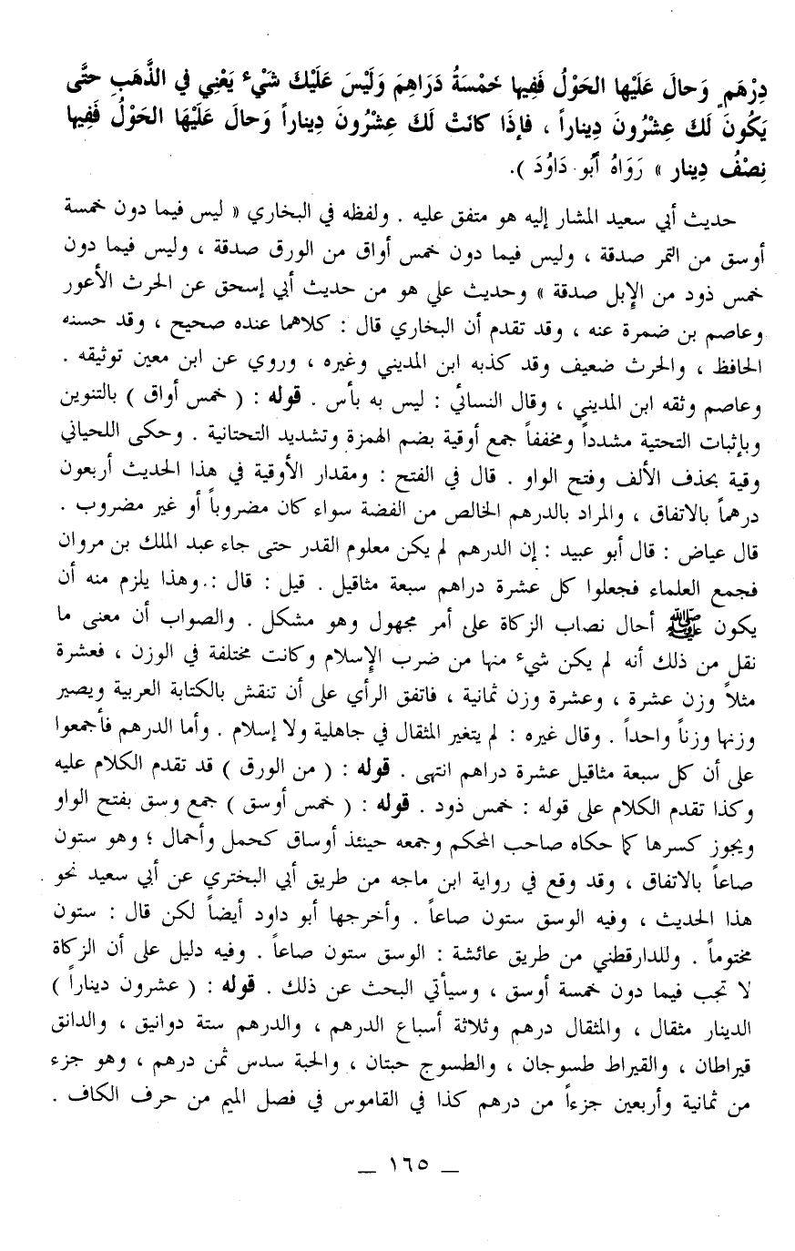 ـــــــــــــــــــــــــــــQدِرْهَمٍ وَحَالَ عَلَيْهَا الْحَوْلُ فَفِيهَا خَمْسَةُ دَرَاهِمَ وَلَيْسَ عَلَيْكَ شَيْءٌ يَعْنِي فِي الذَّهَبِ حَتَّى يَكُونَ لَكَ عِشْرُونَ دِينَارًا، فَإِذَا كَانَتْ لَك عِشْرُونَ دِينَارًا وَحَالَ عَلَيْهَا الْحَوْلُ فَفِيهَا نِصْفُ دِينَارٍ» رَوَاهُ أَبُو دَاوُد) حَدِيثُ أَبِي سَعِيدٍ الْمُشَارِ إلَيْهِ هُوَ مُتَّفَقٌ عَلَيْهِ وَلَفْظُهُ فِي الْبُخَارِيِّ «لَيْسَ فِيمَا دُونَ خَمْسَةِ أَوْسُقٍ مِنْ التَّمْرِ صَدَقَةٌ، وَلَيْسَ فِيمَا دُونَ خَمْسِ أَوَاقٍ مِنْ الْوَرِقِ صَدَقَةٌ، وَلَيْسَ فِيمَا دُونَ خَمْسِ ذَوْدٍ مِنْ الْإِبِلِ صَدَقَةٌ» وَحَدِيثُ عَلِيٍّ هُوَ مِنْ حَدِيثِ أَبِي إِسْحَاقَ عَنْ الْحَارِثِ الْأَعْوَرِ وَعَاصِمِ بْنِ ضَمْرَةَ عَنْهُ، وَقَدْ تَقَدَّمَ أَنَّ الْبُخَارِيَّ قَالَ: كِلَاهُمَا عِنْدَهُ صَحِيحٌ، وَقَدْ حَسَّنَهُ الْحَافِظُ، وَالْحَارِثُ ضَعِيفٌ وَقَدْ كَذَّبَهُ ابْنُ الْمَدِينِيِّ وَغَيْرُهُ، وَرُوِيَ عَنْ ابْنِ مَعِينٍ تَوْثِيقُهُ وَعَاصِمُ وَثَّقَهُ ابْنُ الْمَدِينِيِّ، وَقَالَ النَّسَائِيّ: لَيْسَ بِهِ بَأْسٌ قَوْلُهُ: (خَمْسُ أَوَاقٍ) بِالتَّنْوِينِ وَبِإِثْبَاتِ التَّحْتِيَّةِ مُشَدَّدًا وَمُخَفَّفًا جَمْعُ أُوقِيَّةٍ بِضَمِّ الْهَمْزَةِ وَتَشْدِيدِ التَّحْتَانِيَّةِ وَحَكَى اللِّحْيَانِيُّ وَقِيَّةً بِحَذْفِ الْأَلِفِ وَفَتْحِ الْوَاوِ قَالَ فِي الْفَتْحِ: وَمِقْدَارُ الْأُوقِيَّةِ فِي هَذَا الْحَدِيثِ أَرْبَعُونَ دِرْهَمًا بِالِاتِّفَاقِ، وَالْمُرَادُ بِالدِّرْهَمِ الْخَالِصُ مِنْ الْفِضَّةِ سَوَاءٌ كَانَ مَضْرُوبًا أَوْ غَيْرَ مَضْرُوبٍ قَالَ عِيَاضٌ: قَالَ أَبُو عُبَيْدٍ: إنَّ الدِّرْهَمَ لَمْ يَكُنْ مَعْلُومَ الْقَدْرِ حَتَّى جَاءَ عَبْدُ الْمَلِكِ بْنُ مَرْوَانَ فَجَمَعَ الْعُلَمَاءَ فَجَعَلُوا كُلَّ عَشَرَةِ دَرَاهِمَ سَبْعَةَ مَثَاقِيلَ