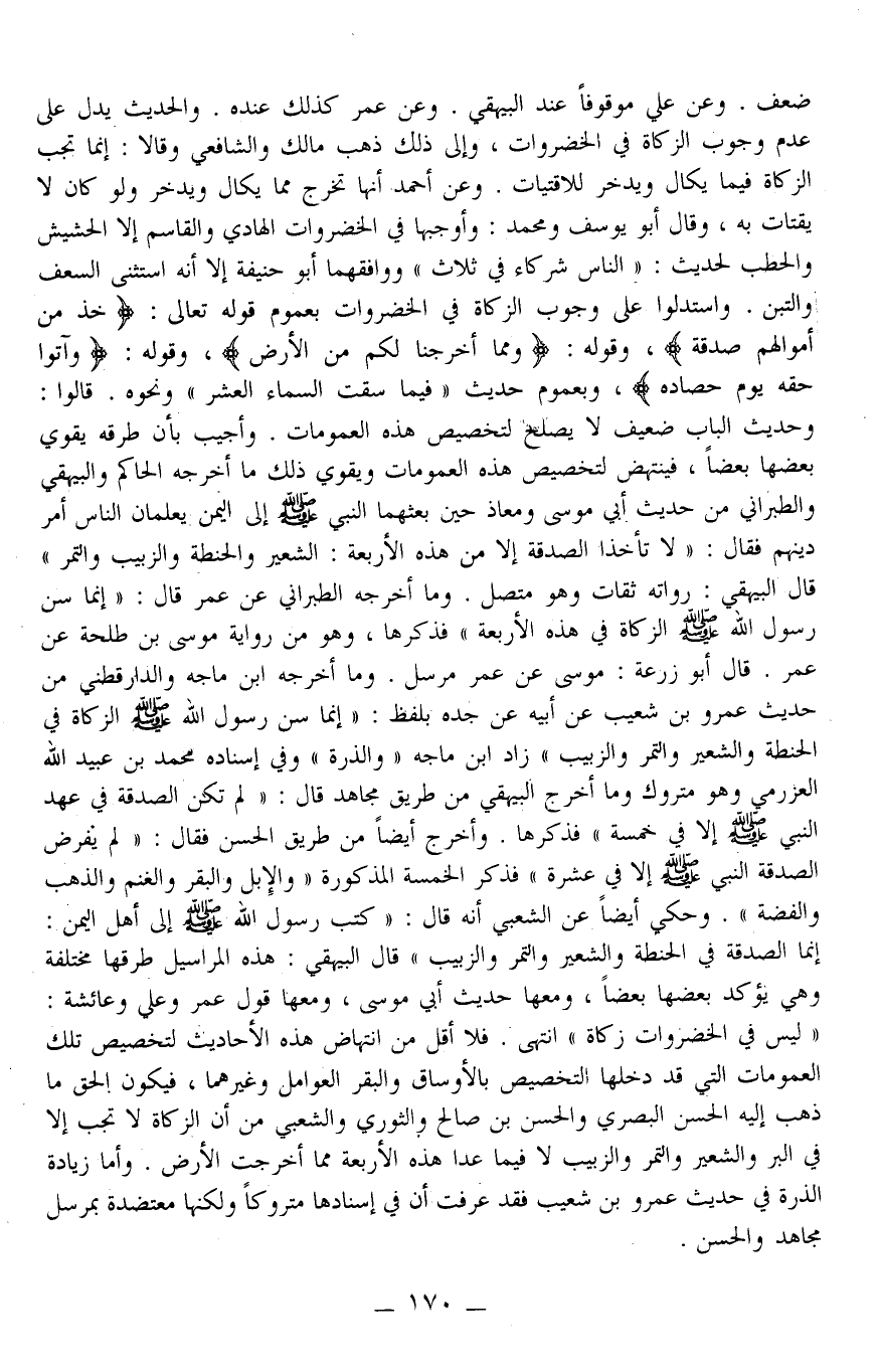 وَهُوَ مِنْ رِوَايَةِ مُوسَى بْنِ طَلْحَةَ عَنْ عُمَرَ قَالَ أَبُو زُرْعَةَ: مُوسَى عَنْ عُمَرَ مُرْسَلٌ وَمَا أَخْرَجَهُ ابْنُ مَاجَهْ وَالدَّارَقُطْنِيّ مِنْ حَدِيثِ عَمْرِو بْنِ شُعَيْبٍ عَنْ أَبِيهِ عَنْ جَدِّهِ بِلَفْظِ: «إنَّمَا سَنَّ رَسُولُ اللَّهِ - صَلَّى اللَّهُ عَلَيْهِ وَسَلَّمَ - الزَّكَاةَ فِي الْحِنْطَةِ وَالشَّعِيرِ وَالتَّمْرِ وَالزَّبِيبِ» زَادَ ابْنُ مَاجَهْ " وَالذُّرَةِ " وَفِي إسْنَادِهِ مُحَمَّدُ بْنُ عُبَيْدِ اللَّهِ الْعَرْزَمِيُّ وَهُوَ مَتْرُوكٌ وَمَا أَخْرَجَ الْبَيْهَقِيُّ مِنْ طَرِيقِ مُجَاهِدٍ قَالَ: «لَمْ تَكُنِ الصَّدَقَةُ فِي عَهْدِ النَّبِيِّ - صَلَّى اللَّهُ عَلَيْهِ وَسَلَّمَ - إلَّا فِي خَمْسَةٍ» فَذَكَرَهَا وَأَخْرَجَ أَيْضًا مِنْ طَرِيقِ الْحَسَنِ فَقَالَ: «لَمْ يَفْرِضْ الصَّدَقَةَ النَّبِيُّ - صَلَّى اللَّهُ عَلَيْهِ وَسَلَّمَ - إلَّا فِي عَشَرَةٍ فَذَكَرَ الْخَمْسَةَ الْمَذْكُورَةَ وَالْإِبِلَ وَالْبَقَرَ وَالْغَنَمَ وَالذَّهَبَ وَالْفِضَّةَ» وَحُكِيَ أَيْضًا عَنْ الشَّعْبِيِّ أَنَّهُ قَالَ: «كَتَبَ رَسُولُ اللَّهِ - صَلَّى اللَّهُ عَلَيْهِ وَسَلَّمَ - إلَى أَهْلِ الْيَمَنِ: إنَّمَا الصَّدَقَةُ فِي الْحِنْطَةِ وَالشَّعِيرِ وَالتَّمْرِ وَالزَّبِيبِ» قَالَ الْبَيْهَقِيُّ: هَذِهِ الْمَرَاسِيلُ طُرُقُهَا مُخْتَلِفَةٌ وَهِيَ يُؤَكِّدُ بَعْضُهَا بَعْضًا، وَمَعَهَا حَدِيثُ أَبِي مُوسَى، وَمَعَهَا قَوْلُ عُمَرَ وَعَلِيٍّ وَعَائِشَةَ: " لَيْسَ فِي الْخَضْرَاوَاتِ زَكَاةٌ " انْتَهَى.
