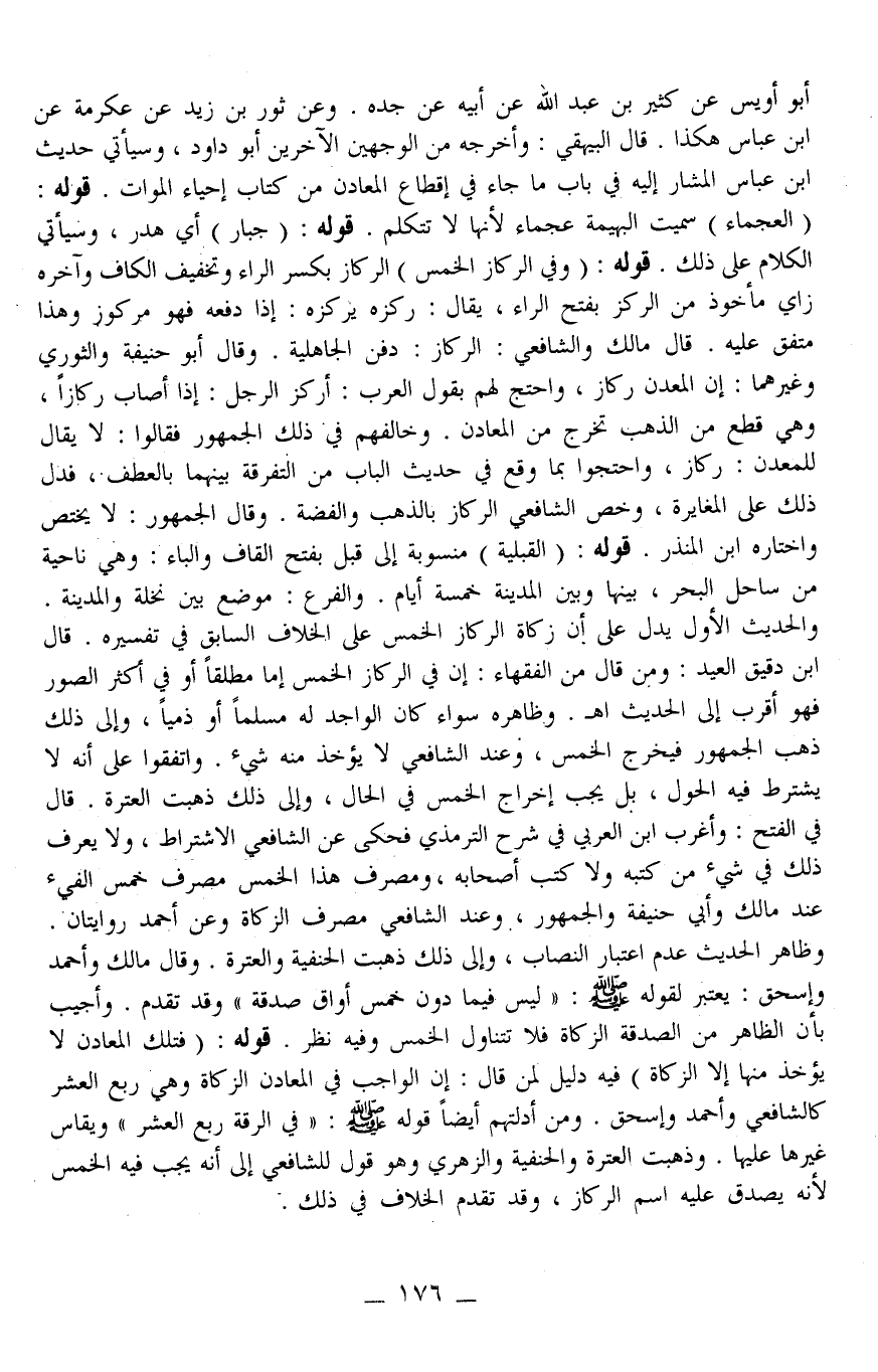 وَخَالَفَهُمْ فِي ذَلِكَ الْجُمْهُورُ فَقَالُوا: لَا يُقَالُ لِلْمَعْدِنِ: رِكَازٌ، وَاحْتَجُّوا بِمَا وَقَعَ فِي حَدِيثِ الْبَابِ مِنْ التَّفْرِقَةِ بَيْنَهُمَا بِالْعَطْفِ، فَدَلَّ ذَلِكَ عَلَى الْمُغَايَرَةِ، وَخَصَّ الشَّافِعِيُّ الرِّكَازَ بِالذَّهَبِ وَالْفِضَّةِ وَقَالَ الْجُمْهُورُ: لَا يُخْتَصُّ وَاخْتَارَهُ ابْنُ الْمُنْذِرِ قَوْلُهُ: (الْقَبَلِيَّةِ) مَنْسُوبَةٌ إلَى قَبَلِ بِفَتْحِ الْقَافِ وَالْبَاءِ: وَهِيَ نَاحِيَةٌ مِنْ سَاحِلِ الْبَحْرِ، بَيْنَهَا وَبَيْنَ الْمَدِينَةِ خَمْسَةُ أَيَّامٍ وَالْفَرْعُ: مَوْضِعٌ بَيْنَ نَخْلَةَ وَالْمَدِينَةِ وَالْحَدِيثُ الْأَوَّلُ يَدُلُّ عَلَى أَنَّ زَكَاةَ الرِّكَازِ الْخُمْسُ عَلَى الْخِلَافِ السَّابِقِ فِي تَفْسِيرِهِ قَالَ ابْنُ دَقِيقِ الْعِيدِ: وَمَنْ قَالَ مِنْ الْفُقَهَاءِ: إنَّ فِي الرِّكَازِ الْخُمْسَ إمَّا مُطْلَقًا أَوْ فِي أَكْثَرِ الصُّوَرِ فَهُوَ أَقْرَبُ إلَى الْحَدِيثِ اهـ وَظَاهِرُهُ سَوَاءٌ كَانَ الْوَاجِدُ لَهُ مُسْلِمًا أَوْ ذِمِّيًّا، وَإِلَى ذَلِكَ ذَهَبَ الْجُمْهُورُ فَيَخْرُجُ الْخُمْسُ، وَعِنْدَ الشَّافِعِيِّ لَا يُؤْخَذُ مِنْهُ شَيْءٌ وَاتَّفَقُوا عَلَى أَنَّهُ لَا يُشْتَرَطُ فِيهِ الْحَوْلُ، بَلْ يَجِبُ إخْرَاجُ الْخُمْسِ فِي الْحَالِ، وَإِلَى ذَلِكَ ذَهَبَتْ الْعِتْرَةُ قَالَ فِي الْفَتْحِ: وَأَغْرَبَ ابْنُ الْعَرَبِيِّ فِي شَرْحِ التِّرْمِذِيِّ فَحَكَى عَنْ الشَّافِعِيِّ الِاشْتِرَاطَ، وَلَا يُعْرَفُ ذَلِكَ فِي شَيْءٍ مِنْ كُتُبِهِ وَلَا كُتُبِ أَصْحَابِهِ، وَمَصْرِفُ هَذَا الْخُمْسِ مَصْرِفُ خُمْسِ الْفَيْءِ عِنْدَ مَالِكٍ وَأَبِي حَنِيفَةَ وَالْجُمْهُورِ، وَعِنْدَ الشَّافِعِيِّ مَصْرِفُ الزَّكَاةِ وَعَنْ أَحْمَدَ رِوَايَتَانِ وَظَاهِرُ الْحَدِيثِ عَدَمُ اعْتِبَارِ النِّصَابِ، وَإِلَى ذَلِكَ ذَهَبَتْ الْحَنَفِيَّةُ وَالْعِتْرَةُ وَقَالَ مَالِكٌ وَأَحْمَدُ وَإِسْحَاقُ: يُعْتَبَرُ لِقَوْلِهِ - صَلَّى اللَّهُ عَلَيْهِ وَسَلَّمَ -: «لَيْسَ فِيمَا دُونَ خَمْسِ أَوَاقٍ صَدَقَةٌ» وَقَدْ تَقَدَّمَ