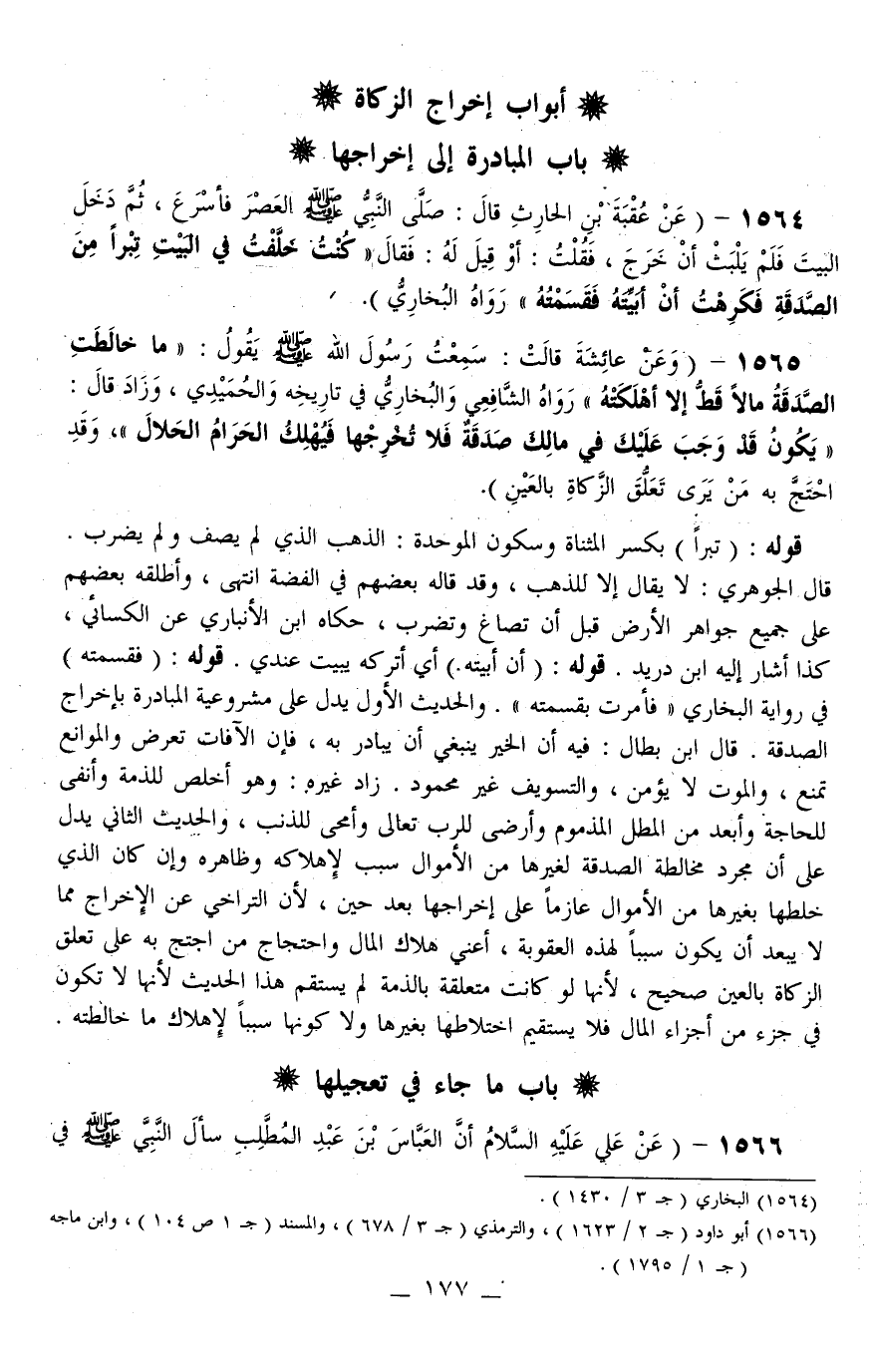 1564 - (عَنْ عُقْبَةَ بْنِ الْحَارِثِ قَالَ: «صَلَّى النَّبِيُّ - صَلَّى اللَّهُ عَلَيْهِ وَسَلَّمَ - الْعَصْرَ فَأَسْرَعَ، ثُمَّ دَخَلَ الْبَيْتَ فَلَمْ يَلْبَثْ أَنْ خَرَجَ، فَقُلْتُ: أَوْ قِيلَ لَهُ: فَقَالَ كُنْت خَلَّفْت فِي الْبَيْتِ تِبْرًا مِنْ الصَّدَقَةِ فَكَرِهْت أَنْ أُبَيِّتَهُ فَقَسَمْتُهُ» رَوَاهُ الْبُخَارِيُّ) .