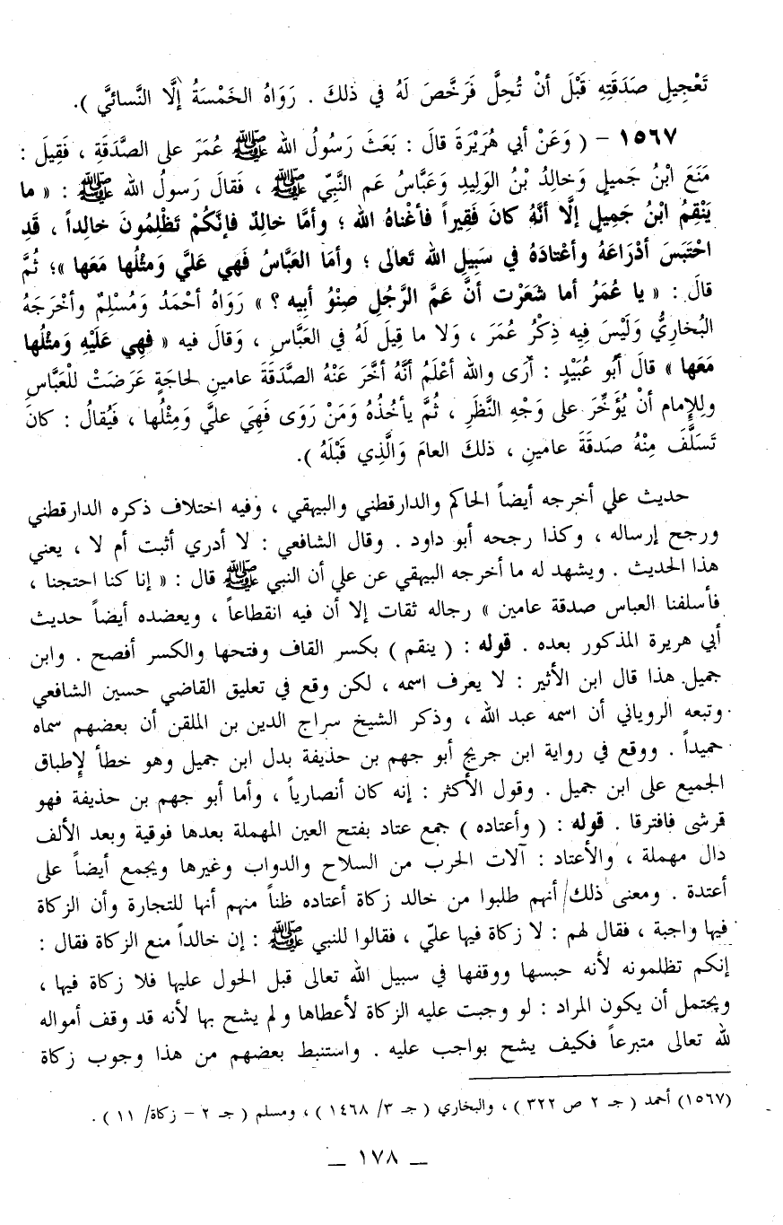 1567 - (وَعَنْ أَبِي هُرَيْرَةَ قَالَ: «بَعَثَ رَسُولُ اللَّهِ - صَلَّى اللَّهُ عَلَيْهِ وَسَلَّمَ - عُمَرَ عَلَى الصَّدَقَةِ، فَقِيلَ: مَنَعَ ابْنُ جَمِيلٍ وَخَالِدُ بْنُ الْوَلِيدِ وَعَبَّاسٌ عَمُّ النَّبِيِّ - صَلَّى اللَّهُ عَلَيْهِ وَسَلَّمَ -، فَقَالَ رَسُولُ اللَّهِ - صَلَّى اللَّهُ عَلَيْهِ وَسَلَّمَ -: مَا يَنْقِمُ ابْنُ جَمِيلٍ إلَّا أَنَّهُ كَانَ فَقِيرًا فَأَغْنَاهُ اللَّهُ؛ وَأَمَّا خَالِدٌ فَإِنَّكُمْ تَظْلِمُونَ خَالِدًا، قَدْ احْتَبَسَ أَدْرَاعَهُ وَأَعْتَادَهُ فِي سَبِيلِ اللَّهِ تَعَالَى؛ وَأَمَّا الْعَبَّاسُ فَهِيَ عَلَيَّ وَمِثْلُهَا مَعَهَا؛ ثُمَّ قَالَ: يَا عُمَرُ أَمَا شَعَرْت أَنَّ عَمَّ الرَّجُلِ صِنْوُ أَبِيهِ؟» رَوَاهُ أَحْمَدُ وَمُسْلِمٌ وَأَخْرَجَهُ الْبُخَارِيُّ وَلَيْسَ فِيهِ ذِكْرُ عُمَرَ، وَلَا مَا قِيلَ لَهُ فِي الْعَبَّاسِ، وَقَالَ فِيهِ " فَهِيَ عَلَيْهِ وَمِثْلُهَا مَعَهَا " قَالَ أَبُو عُبَيْدٍ: أَرَى - وَاَللَّهُ أَعْلَمُ - أَنَّهُ أَخَّرَ عَنْهُ الصَّدَقَةَ عَامَيْنِ لِحَاجَةٍ عَرَضَتْ لِلْعَبَّاسِ وَلِلْإِمَامِ أَنْ يُؤَخِّرَ عَلَى وَجْهِ النَّظَرِ، ثُمَّ يَأْخُذَهُ، وَمَنْ رَوَى فَهِيَ عَلَيَّ وَمِثْلُهَا، فَيُقَالُ: كَانَ تَسَلَّفَ مِنْهُ صَدَقَةَ عَامَيْنِ، ذَلِكَ الْعَامِ وَاَلَّذِي قَبْلَهُ) حَدِيثُ عَلِيٍّ أَخْرَجَهُ أَيْضًا الْحَاكِمُ وَالدَّارَقُطْنِيّ وَالْبَيْهَقِيُّ، فِيهِ اخْتِلَافٌ ذَكَرَهُ الدَّارَقُطْنِيّ وَرَجَّحَ إرْسَالَهُ، وَكَذَا رَجَّحَهُ أَبُو دَاوُد وَقَالَ الشَّافِعِيُّ: لَا أَدْرِي أَثَبَتَ أَمْ لَا، يَعْنِي هَذَا الْحَدِيثَ وَيَشْهَدُ لَهُ مَا أَخْرَجَهُ الْبَيْهَقِيُّ عَنْ عَلِيٍّ أَنَّ النَّبِيَّ - صَلَّى اللَّهُ عَلَيْهِ وَسَلَّمَ - قَالَ: «إنَّا كُنَّا احْتَجْنَا، فَأَسْلَفَنَا الْعَبَّاسُ صَدَقَةَ عَامَيْنِ» رِجَالُهُ ثِقَاتٌ إلَّا أَنَّ فِيهِ انْقِطَاعًا، وَيُعَضِّدُهُ أَيْضًا حَدِيثُ أَبِي هُرَيْرَةَ الْمَذْكُورُ بَعْدَهُ قَوْلُهُ: (يَنْقِمُ) بِكَسْرِ الْقَافِ وَفَتْحِهَا وَالْكَسْرُ أَفْصَحُ وَابْنُ جَمِيلٍ هَذَا قَالَ ابْنُ الْأَثِيرِ: لَا يُعْرَفُ اسْمُهُ، لَكِنْ وَقَعَ فِي تَعْلِيقِ الْقَاضِي حُسَيْنٍ الشَّافِعِيِّ وَتَبِعَهُ الرُّويَانِيُّ أَنَّ اسْمَهُ عَبْدُ اللَّهِ، وَذَكَرَ الشَّيْخُ سِرَاجُ الدِّينِ بْنُ الْمُلَقِّنِ أَنَّ بَعْضَهُمْ سَمَّاهُ حُمَيْدًا وَوَقَعَ فِي رِوَايَةِ ابْنِ جُرَيْجٍ أَبُو جَهْمِ بْنُ حُذَيْفَةَ بَدَلَ ابْنِ جَمِيلٍ وَهُوَ خَطَأٌ لِإِطْبَاقِ الْجَمِيعِ عَلَى ابْنِ جَمِيلٍ وَقَوْلُ الْأَكْثَرِ: إنَّهُ كَانَ أَنْصَارِيًّا، وَأَمَّا أَبُو جَهْمِ بْنُ حُذَيْفَةَ فَهُوَ قُرَشِيٌّ فَافْتَرَقَا