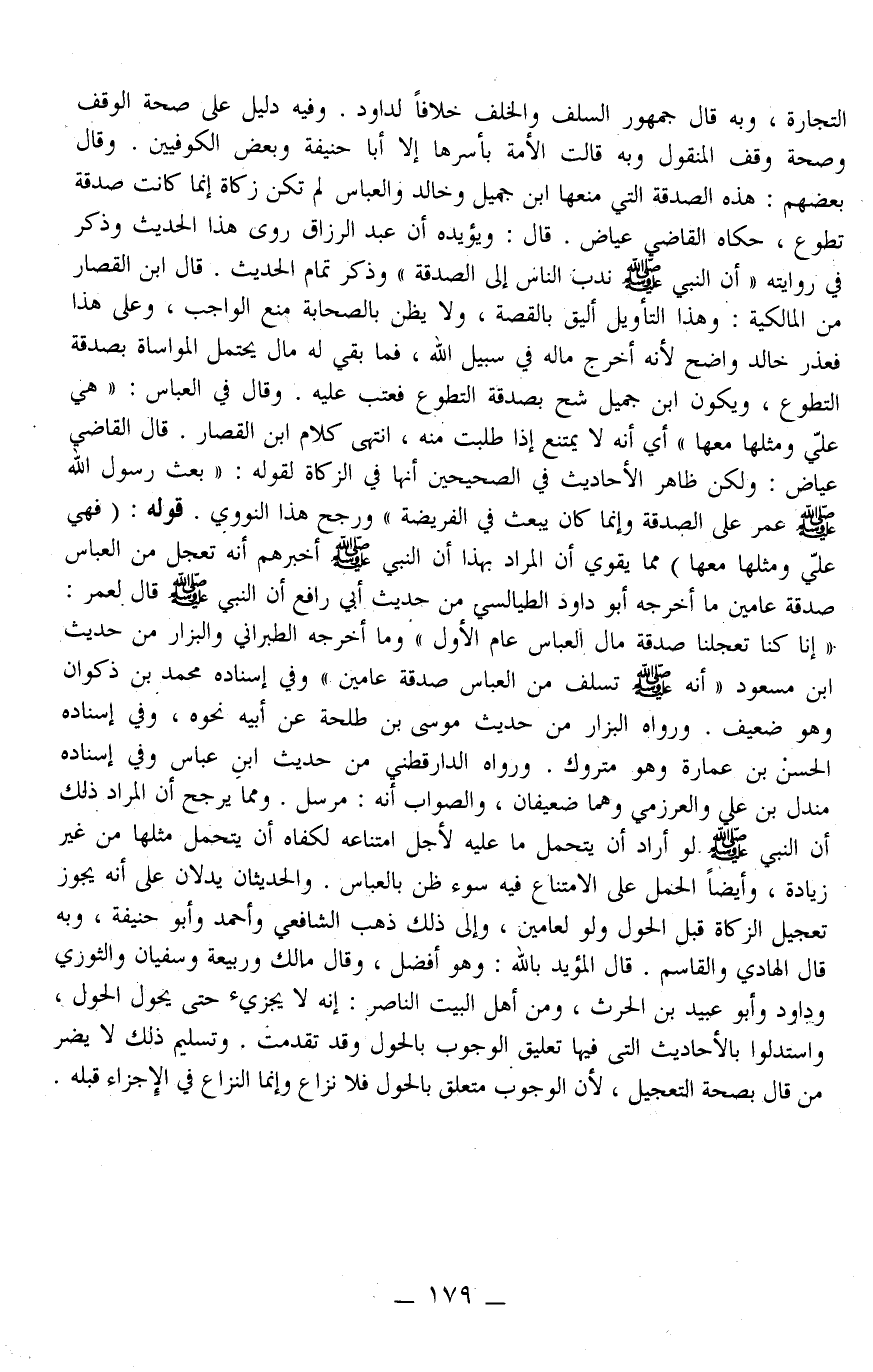 ـــــــــــــــــــــــــــــQالتِّجَارَةِ، وَبِهِ قَالَ جُمْهُورُ السَّلَفِ وَالْخَلَفِ خِلَافًا لِدَاوُدَ وَفِيهِ دَلِيلٌ عَلَى صِحَّةِ الْوَقْفِ وَصِحَّةِ وَقْفِ الْمَنْقُولِ وَبِهِ قَالَتْ الْأُمَّةُ بِأَسْرِهَا إلَّا أَبَا حَنِيفَةَ وَبَعْضَ الْكُوفِيِّينَ وَقَالَ بَعْضُهُمْ: هَذِهِ الصَّدَقَةُ الَّتِي مَنَعَهَا ابْنُ جَمِيلٍ وَخَالِدٌ وَالْعَبَّاسُ لَمْ تَكُنْ زَكَاةً إنَّمَا كَانَتْ صَدَقَةَ تَطَوُّعٍ، حَكَاهُ الْقَاضِي عِيَاضٌ قَالَ: وَيُؤَيِّدُهُ أَنَّ عَبْدَ الرَّزَّاقِ رَوَى هَذَا الْحَدِيثَ وَذَكَرَ فِي رِوَايَتِهِ «أَنَّ النَّبِيَّ - صَلَّى اللَّهُ عَلَيْهِ وَسَلَّمَ - نَدَبَ النَّاسَ إلَى الصَّدَقَةِ» وَذَكَرَ تَمَامَ الْحَدِيثِ قَالَ ابْنُ الْقَصَّارِ مِنْ الْمَالِكِيَّةِ: وَهَذَا التَّأْوِيلُ أَلْيَقُ بِالْقِصَّةِ، وَلَا يُظَنُّ بِالصَّحَابَةِ مَنْعُ الْوَاجِبِ، وَعَلَى هَذَا فَعُذْرُ خَالِدٍ وَاضِحٌ لِأَنَّهُ أَخْرَجَ مَالَهُ فِي سَبِيلِ اللَّهِ، فَمَا بَقِيَ لَهُ مَالٌ يَحْتَمِلُ الْمُوَاسَاةَ بِصَدَقَةِ التَّطَوُّعِ، وَيَكُونُ ابْنُ جَمِيلٍ شَحَّ بِصَدَقَةِ التَّطَوُّعِ فَعَتَبَ عَلَيْهِ وَقَالَ فِي الْعَبَّاسِ: " هِيَ عَلَيَّ وَمِثْلُهَا مَعَهَا " أَيْ أَنَّهُ لَا يَمْتَنِعُ إذَا طُلِبَتْ مِنْهُ، انْتَهَى كَلَامُ ابْنِ الْقَصَّارِ قَالَ الْقَاضِي عِيَاضٌ: وَلَكِنَّ ظَاهِرَ الْأَحَادِيثِ فِي الصَّحِيحَيْنِ أَنَّهَا فِي الزَّكَاةِ لِقَوْلِهِ: «بَعَثَ رَسُولُ اللَّهِ - صَلَّى اللَّهُ عَلَيْهِ وَسَلَّمَ - عُمَرَ عَلَى الصَّدَقَةِ وَإِنَّمَا كَانَ يَبْعَثُ فِي الْفَرِيضَةِ» وَرَجَّحَ هَذَا النَّوَوِيُّ قَوْلُهُ: (فَهِيَ عَلَيَّ وَمِثْلُهَا مَعَهَا) مِمَّا يُقَوِّي أَنَّ الْمُرَادَ بِهَذَا أَنَّ النَّبِيَّ - صَلَّى اللَّهُ عَلَيْهِ وَسَلَّمَ - أَخْبَرَهُمْ أَنَّهُ تَعَجَّلَ مِنْ الْعَبَّاسِ صَدَقَةَ عَامَيْنِ مَا أَخْرَجَهُ أَبُو دَاوُد الطَّيَالِسِيُّ مِنْ حَدِيثِ أَبِي رَافِعٍ «أَنَّ النَّبِيَّ - صَلَّى اللَّهُ عَلَيْهِ وَسَلَّمَ - قَالَ لِعُمَرَ: إنَّا كُنَّا تَعَجَّلْنَا صَدَقَةَ مَالِ الْعَبَّاسِ عَامَ الْأَوَّلِ» وَمَا أَخْرَجَهُ الطَّبَرَانِيُّ وَالْبَزَّارُ مِنْ حَدِيثِ ابْنِ مَسْعُودٍ «أَنَّهُ - صَلَّى اللَّهُ عَلَيْهِ وَسَلَّمَ - تَسَلَّفَ مِنْ الْعَبَّاسِ صَدَقَةَ عَامَيْنِ» وَفِي إسْنَادِهِ مُحَمَّدُ بْنُ ذَكْوَانَ وَهُوَ ضَعِيفٌ وَرَوَاهُ الْبَزَّارُ مِنْ حَدِيثِ مُوسَى بْنِ طَلْحَةَ عَنْ أَبِيهِ نَحْوَهُ، فِي إسْنَادِهِ الْحَسَنُ بْنُ عُمَارَةَ وَهُوَ مَتْرُوكٌ وَرَوَاهُ الدَّارَقُطْنِيّ مِنْ حَدِيثِ ابْنِ عَبَّاسٍ وَفِي إسْنَادِهِ مِنْدَلُ بْنُ عَلِيٍّ وَالْعَزْرَمِيُّ وَهُمَا ضَعِيفَانِ، وَالصَّوَابُ أَنَّهُ: مُرْسَلٌ وَمِمَّا يُرَجِّحُ أَنَّ الْمُرَادَ ذَلِكَ أَنَّ النَّبِيَّ - صَلَّى اللَّهُ عَلَيْهِ وَسَلَّمَ - لَوْ أَرَادَ أَنْ يَتَحَمَّلَ مَا عَلَيْهِ لِأَجْلِ امْتِنَاعِهِ لَكَفَاهُ أَنْ يَتَحَمَّلَ مِثْلَهَا مِنْ غَيْرِ زِيَادَةٍ، وَأَيْضًا الْحَمْلُ عَلَى الِامْتِنَاعِ فِيهِ سُوءُ ظَنٍّ بِالْعَبَّاسِ