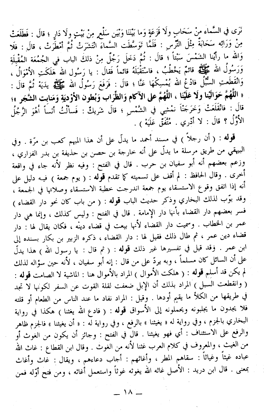 ـــــــــــــــــــــــــــــQنَرَى فِي السَّمَاءِ مِنْ سَحَابٍ وَلَا قَزَعَةٍ وَمَا بَيْنَنَا وَبَيْنَ سَلْعٍ مِنْ بَيْتٍ وَلَا دَارٍ، قَالَ: فَطَلَعَتْ مِنْ وَرَاءَهِ سَحَابَةٌ مِثْلُ التُّرْسِ: فَلَمَّا تَوَسَّطَتْ السَّمَاءَ انْتَشَرَتْ ثُمَّ أَمْطَرَتْ، قَالَ: فَلَا وَاَللَّهِ مَا رَأَيْنَا الشَّمْسَ سَبْتًا قَالَ: ثُمَّ دَخَلَ رَجُلٌ مِنْ ذَلِكَ الْبَابِ فِي الْجُمُعَةِ الْمُقْبِلَةِ وَرَسُولُ اللَّهِ - صَلَّى اللَّهُ عَلَيْهِ وَسَلَّمَ - قَائِمًا يَخْطُبُ. فَاسْتَقْبَلَهُ قَائِمًا فَقَالَ: يَا رَسُولَ اللَّهِ هَلَكَتْ الْأَمْوَالُ، وَانْقَطَعَتْ السُّبُلُ فَادْعُ اللَّهَ يُمْسِكْهَا عَنَّا؛ قَالَ: فَرَفَعَ رَسُولُ اللَّهِ - صَلَّى اللَّهُ عَلَيْهِ وَسَلَّمَ - يَدَيْهِ ثُمَّ قَالَ: اللَّهُمَّ حَوَالَيْنَا وَلَا عَلَيْنَا، اللَّهُمَّ عَلَى الْآكَامِ وَالظِّرَابِ وَبُطُونِ الْأَوْدِيَةِ وَمَنَابِتِ الشَّجَرِ؛ قَالَ: فَانْقَلَعَتْ وَخَرَجْنَا نَمْشِي فِي الشَّمْسِ، قَالَ شَرِيكٌ: فَسَأَلْتُ أَنَسًا أَهُوَ الرَّجُلُ الْأَوَّلُ؟ قَالَ: لَا أَدْرِي» مُتَّفَقٌ عَلَيْهِ) .