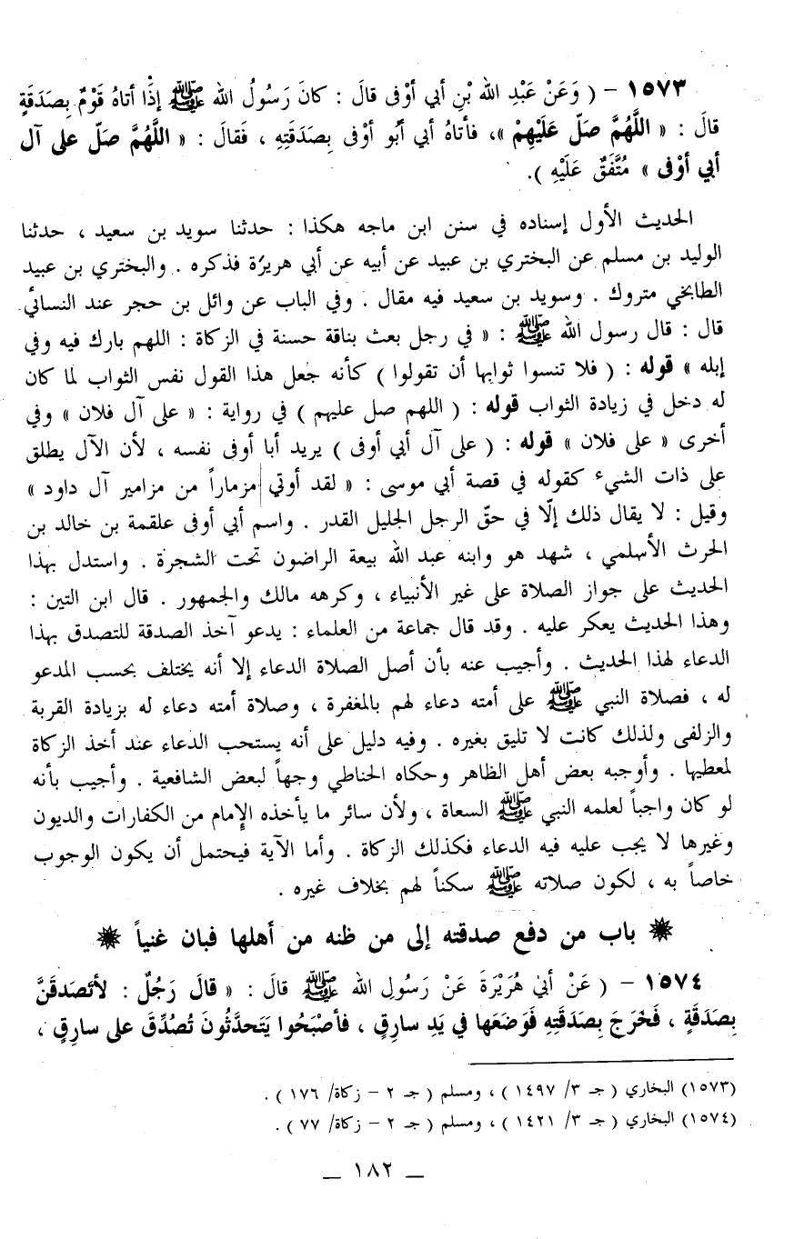 ـــــــــــــــــــــــــــــQ1573 - (وَعَنْ عَبْدِ اللَّهِ بْنِ أَبِي أَوْفَى قَالَ: «كَانَ رَسُولُ اللَّهِ - صَلَّى اللَّهُ عَلَيْهِ وَسَلَّمَ - إذَا أَتَاهُ قَوْمٌ بِصَدَقَةٍ قَالَ: اللَّهُمَّ صَلِّ عَلَيْهِمْ، فَأَتَاهُ أَبِي أَبُو أَوْفَى بِصَدَقَتِهِ، فَقَالَ: اللَّهُمَّ صَلِّ عَلَى آلِ أَبِي أَوْفَى» مُتَّفَقٌ عَلَيْهِ) . الْحَدِيثُ الْأَوَّلُ: إسْنَادُهُ فِي سُنَنِ ابْنِ مَاجَهْ هَكَذَا: حَدَّثَنَا سُوَيْد بْنُ سَعِيدٍ، حَدَّثَنَا الْوَلِيدُ بْنُ مُسْلِمٍ عَنْ الْبَخْتَرِيِّ بْنِ عُبَيْدٍ عَنْ أَبِيهِ عَنْ أَبِي هُرَيْرَةَ فَذَكَرَهُ وَالْبَخْتَرِيُّ بْنُ عُبَيْدٍ الطَّابِخِيُّ مَتْرُوكٌ. وَسُوَيْدِ بْنُ سَعِيدٍ فِيهِ مَقَالٌ