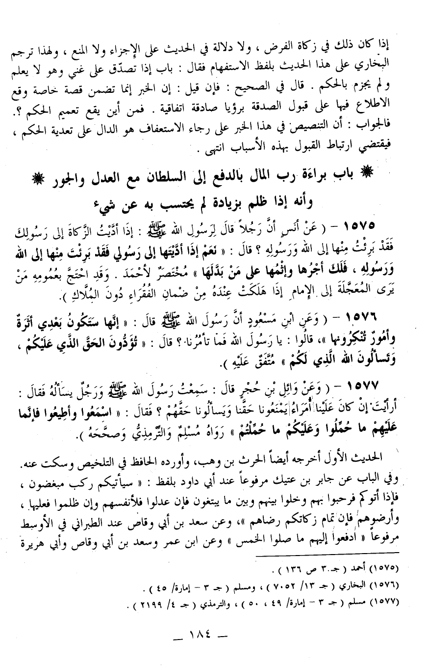 1575 - (عَنْ أَنَسٍ «أَنَّ رَجُلًا قَالَ لِرَسُولِ اللَّهِ - صَلَّى اللَّهُ عَلَيْهِ وَسَلَّمَ -: إذَا أَدَّيْتَ الزَّكَاةَ إلَى رَسُولِكَ فَقَدْ بَرِئْت مِنْهَا إلَى اللَّهِ وَرَسُولِهِ؟ قَالَ: نَعَمْ إذَا أَدَّيْتَهَا إلَى رَسُولٍ فَقَدْ بَرِئْت مِنْهَا إلَى اللَّهِ وَرَسُولِهِ، فَلَكَ أَجْرُهَا وَإِثْمُهَا عَلَى مَنْ بَدَّلَهَا» مُخْتَصَرٌ لِأَحْمَدَ. وَقَدْ احْتَجَّ بِعُمُومِهِ مَنْ يَرَى الْمُعَجَّلَةَ إلَى الْإِمَامِ إذَا هَلَكَتْ عِنْدَهُ مِنْ ضَمَانِ الْفُقَرَاءِ دُونَ الْمُلَّاكِ) .