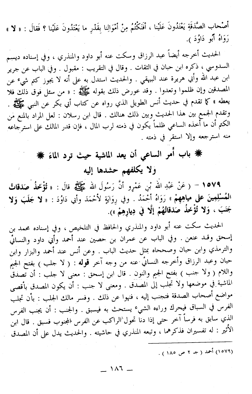 1579 - (عَنْ عَبْدِ اللَّهِ بْنِ عَمْرٍو أَنَّ رَسُولَ اللَّهِ - صَلَّى اللَّهُ عَلَيْهِ وَسَلَّمَ - قَالَ: «تُؤْخَذُ صَدَقَاتُ الْمُسْلِمِينَ عَلَى مِيَاهِهِمْ» رَوَاهُ أَحْمَدُ.