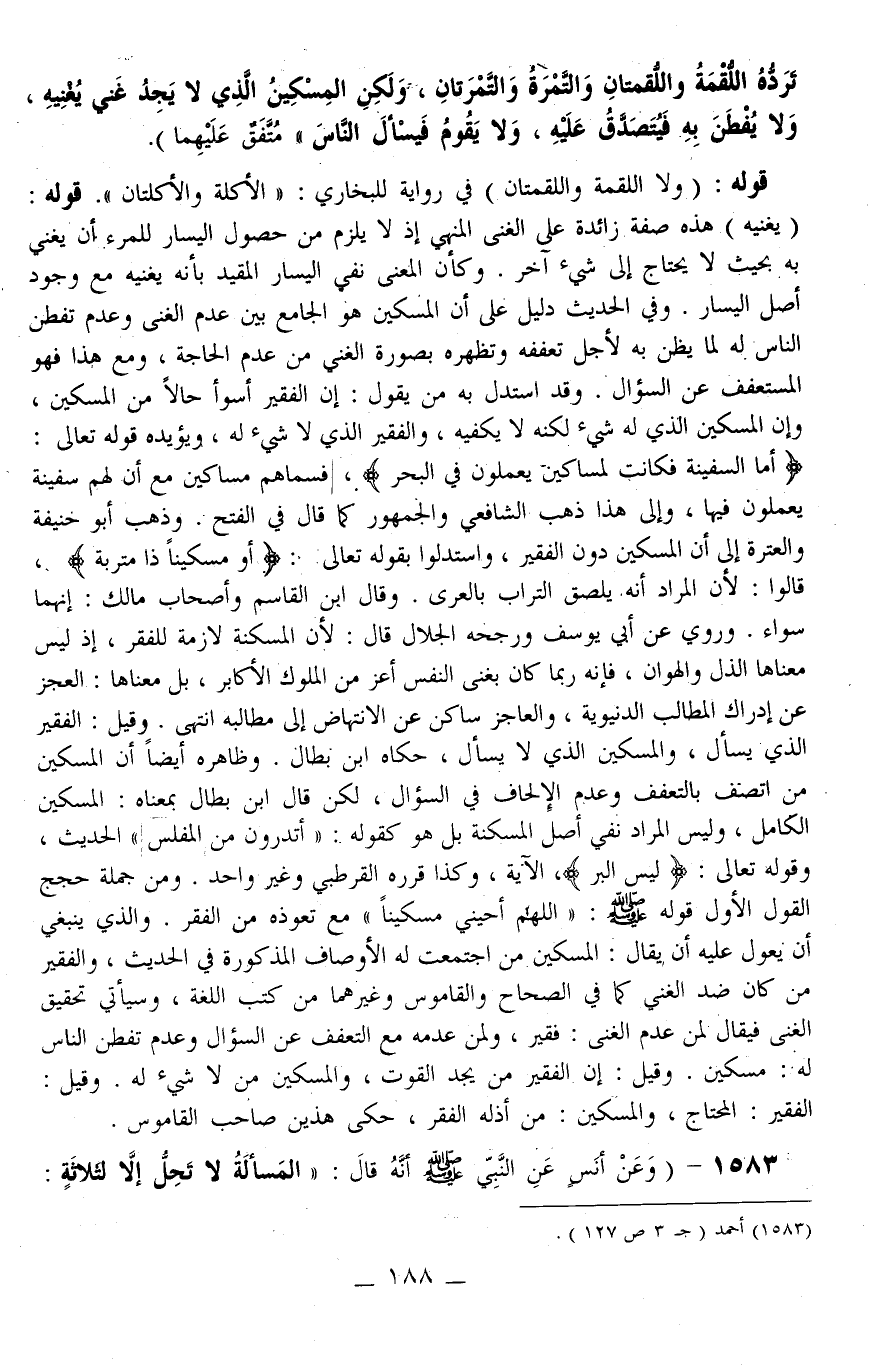 1583 - (وَعَنْ أَنَسٍ عَنْ النَّبِيِّ - صَلَّى اللَّهُ عَلَيْهِ وَسَلَّمَ - أَنَّهُ قَالَ: «الْمَسْأَلَةُ لَا تَحِلُّ إلَّا لِثَلَاثَةٍ