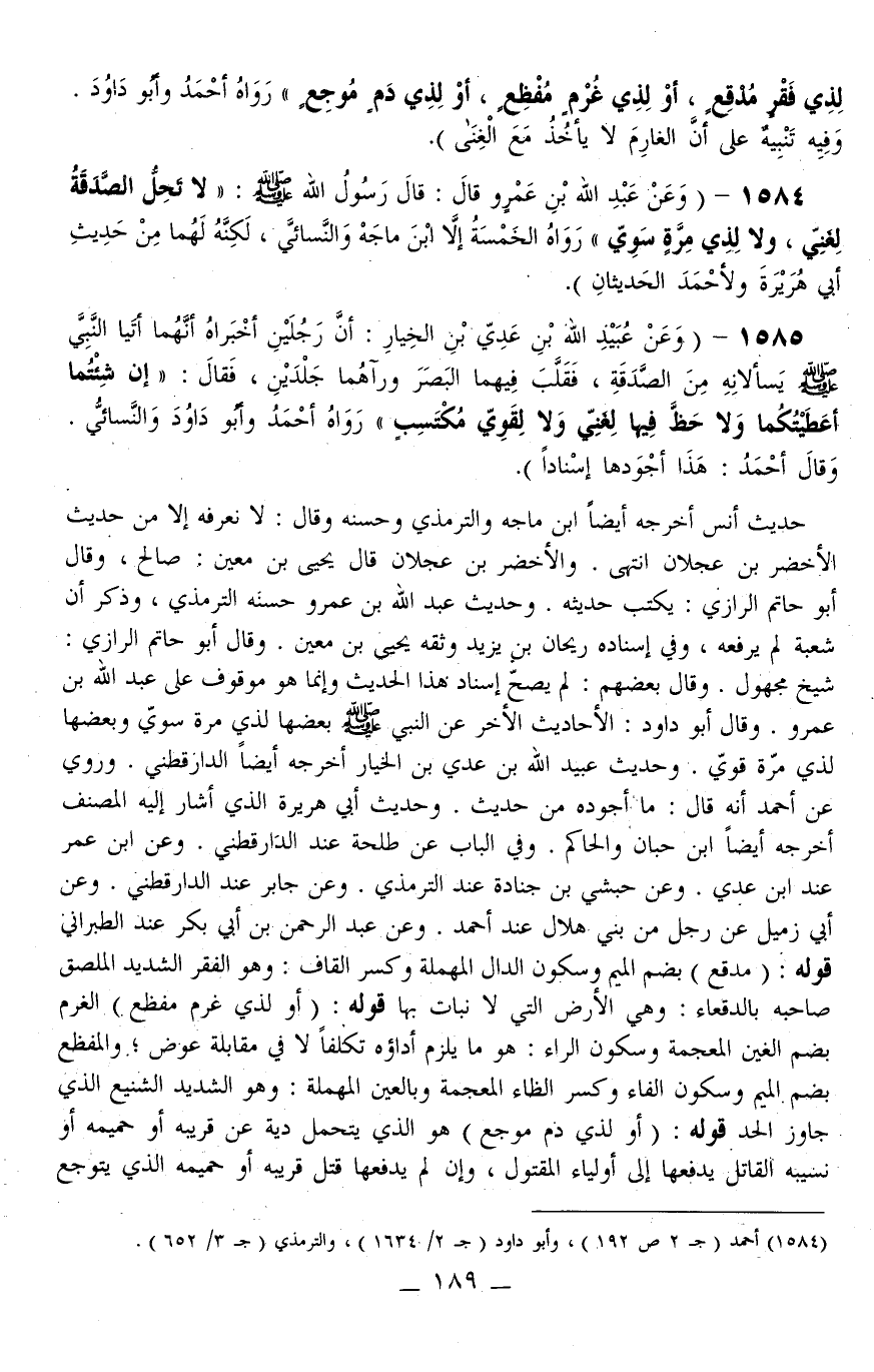 1584 - (وَعَنْ عَبْدِ اللَّهِ بْنِ عَمْرٍو قَالَ: قَالَ رَسُولُ اللَّهِ - صَلَّى اللَّهُ عَلَيْهِ وَسَلَّمَ -: «لَا تَحِلُّ الصَّدَقَةُ لِغَنِيٍّ، وَلَا لِذِي مِرَّةٍ سَوِيٍّ» رَوَاهُ الْخَمْسَةُ إلَّا ابْنَ مَاجَهْ وَالنَّسَائِيُّ، لَكِنَّهُ لَهُمَا مِنْ حَدِيثِ أَبِي هُرَيْرَةَ وَلِأَحْمَدَ الْحَدِيثَانِ) .
