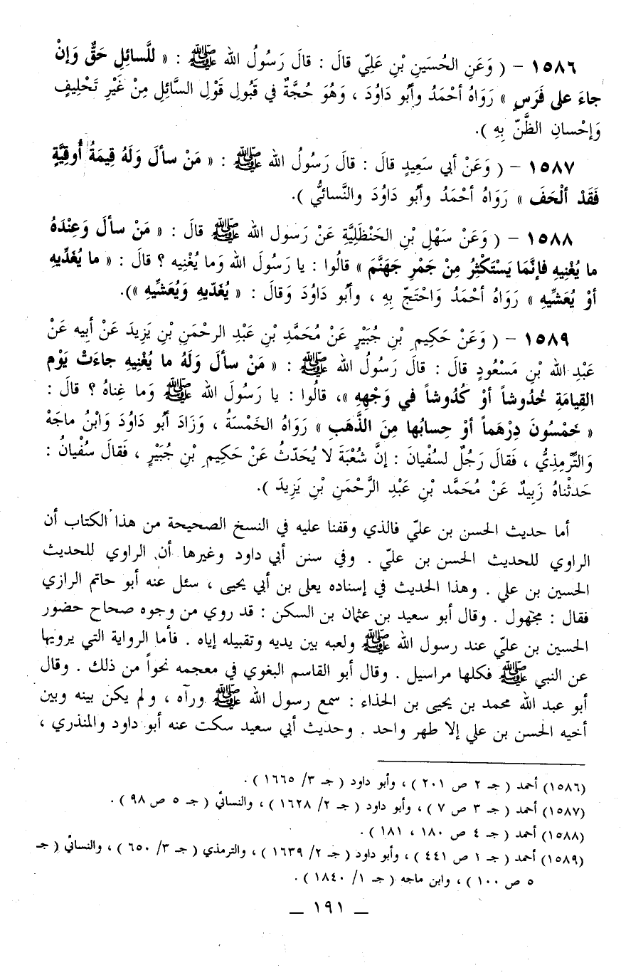 1589 - (وَعَنْ حَكِيمِ بْنِ جُبَيْرٍ عَنْ مُحَمَّدِ بْنِ عَبْدِ الرَّحْمَنِ بْنِ يَزِيدَ عَنْ أَبِيهِ عَنْ عَبْدِ اللَّهِ بْنِ مَسْعُودٍ قَالَ: قَالَ رَسُولُ اللَّهِ - صَلَّى اللَّهُ عَلَيْهِ وَسَلَّمَ -: «مَنْ سَأَلَ وَلَهُ مَا يُغْنِيهِ جَاءَ يَوْمَ الْقِيَامَةِ خُدُوشًا أَوْ كُدُوشًا فِي وَجْهِهِ قَالُوا: يَا رَسُولَ اللَّهِ - صَلَّى اللَّهُ عَلَيْهِ وَسَلَّمَ - وَمَا غِنَاهُ؟ قَالَ: خَمْسُونَ دِرْهَمًا أَوْ حِسَابُهَا مِنْ الذَّهَبِ» رَوَاهُ الْخَمْسَةُ، وَزَادَ أَبُو دَاوُد وَابْنُ مَاجَهْ وَالتِّرْمِذِيُّ، فَقَالَ رَجُلٌ لِسُفْيَانَ: إنَّ شُعْبَةَ لَا يُحَدِّثُ عَنْ حَكِيمِ بْنِ جُبَيْرٍ، فَقَالَ سُفْيَانُ: حَدَّثَنَاهُ زُبَيْدٌ عَنْ مُحَمَّدِ بْنِ عَبْدِ الرَّحْمَنِ بْنِ يَزِيدَ)