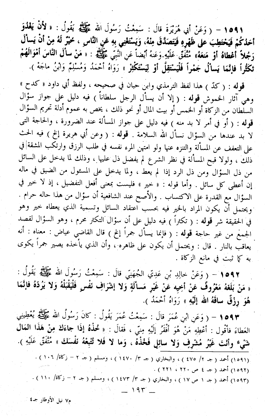 1591 - (وَعَنْ أَبِي هُرَيْرَةَ قَالَ: سَمِعْتُ رَسُولَ اللَّهِ - صَلَّى اللَّهُ عَلَيْهِ وَسَلَّمَ - يَقُولُ: «لَأَنْ يَغْدُوَ أَحَدُكُمْ فَيَحْتَطِبَ عَلَى ظَهْرِهِ فَيَتَصَدَّقَ مِنْهُ، وَيَسْتَغْنِيَ بِهِ عَنْ النَّاسِ، خَيْرٌ لَهُ مِنْ أَنْ يَسْأَلَ رَجُلًا أَعْطَاهُ أَوْ مَنَعَهُ» مُتَّفَقٌ عَلَيْهِ. وَعَنْهُ أَيْضًا عَنْ النَّبِيِّ - صَلَّى اللَّهُ عَلَيْهِ وَسَلَّمَ -: «مَنْ سَأَلَ النَّاسَ أَمْوَالَهُمْ تَكَثُّرًا فَإِنَّمَا يَسْأَلُ جَمْرًا فَلْيَسْتَقِلَّ أَوْ لِيَسْتَكْثِرْ» رَوَاهُ أَحْمَدُ وَمُسْلِمٌ وَابْنُ مَاجَهْ)