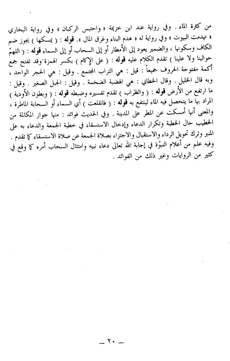 ـــــــــــــــــــــــــــــQمِنْ كَثْرَةِ الْمَاءِ وَفِي رِوَايَةٍ عِنْدَ ابْنُ خُزَيْمَةَ " وَاحْتَبَسَ الرُّكْبَانُ " وَفِي رِوَايَةِ الْبُخَارِيِّ تَهَدَّمَتْ الْبُيُوتُ " وَفِي رِوَايَةٍ لَهُ " هُدِمَ الْبِنَاءُ وَغَرَقَ الْمَالُ ". قَوْلُهُ: (يُمْسِكُهَا) يَجُوزُ ضَمُّ الْكَافِ وَسُكُونُهَا، وَالضَّمِيرُ يَعُودُ إلَى الْأَمْطَارِ أَوْ إلَى السَّحَابِ أَوْ إلَى السَّمَاءِ. قَوْلُهُ: (اللَّهُمَّ حَوَالَيْنَا وَلَا عَلَيْنَا) تَقَدَّمَ الْكَلَامُ عَلَيْهِ. قَوْلُهُ: (عَلَى الْإِكَامِ) بِكَسْرِ الْهَمْزَةِ. وَقَدْ تُفْتَحُ جَمْعُ أَكَمَةٍ، مَفْتُوحَةِ الْحُرُوفِ جَمِيعًا: قِيلَ: هِيَ التُّرَابُ الْمُجْتَمِعُ وَقِيلَ: هِيَ الْحَجَرُ الْوَاحِدُ، وَبِهِ قَالَ الْخَلِيلُ وَقَالَ الْخَطَّابِيِّ: هِيَ الْهَضْبَةُ الضَّخْمَةُ وَقِيلَ: الْجَبَلُ الصَّغِيرُ وَقِيلَ: مَا ارْتَفَعَ مِنْ الْأَرْضِ.