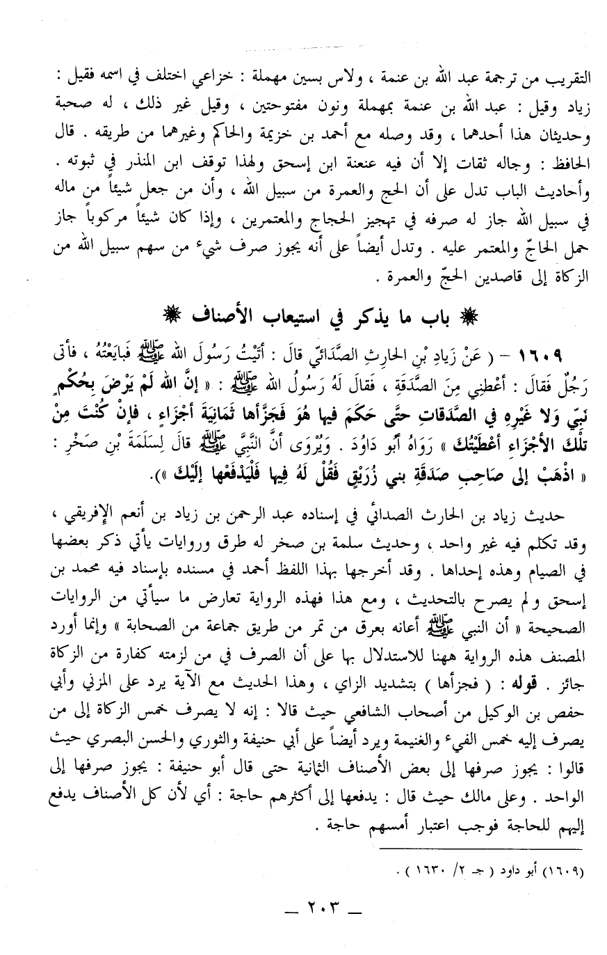 1609 - (عَنْ زِيَادِ بْنِ الْحَارِثِ الصُّدَائِيِّ قَالَ: «أَتَيْتُ رَسُولَ اللَّهِ - صَلَّى اللَّهُ عَلَيْهِ وَسَلَّمَ - فَبَايَعْتُهُ، فَأَتَى رَجُلٌ فَقَالَ: أَعْطِنِي مِنْ الصَّدَقَةِ، فَقَالَ لَهُ رَسُولُ اللَّهِ - صَلَّى اللَّهُ عَلَيْهِ وَسَلَّمَ -: إنَّ اللَّهَ لَمْ يَرْضَ بِحُكْمِ نَبِيٍّ وَلَا غَيْرِهِ فِي الصَّدَقَاتِ حَتَّى حَكَمَ فِيهَا هُوَ فَجَزَّأَهَا ثَمَانِيَةَ أَجْزَاءٍ، فَإِنْ كُنْتَ مِنْ تِلْكَ الْأَجْزَاءِ أَعْطَيْتُكَ» رَوَاهُ أَبُو دَاوُد. وَيُرْوَى «أَنَّ النَّبِيَّ - صَلَّى اللَّهُ عَلَيْهِ وَسَلَّمَ - قَالَ لِسَلَمَةَ بْنِ صَخْرٍ: اذْهَبْ إلَى صَاحِبِ صَدَقَةِ بَنِي زُرَيْقٍ فَقُلْ لَهُ فِيهَا فَلْيَدْفَعْهَا إلَيْكَ» )