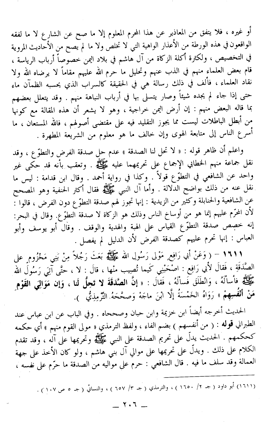 1611 - (وَعَنْ أَبِي رَافِعٍ مَوْلَى رَسُولِ اللَّهِ - صَلَّى اللَّهُ عَلَيْهِ وَسَلَّمَ - «بَعَثَ رَجُلًا مِنْ بَنِي مَخْزُومٍ عَلَى الصَّدَقَةِ، فَقَالَ لِأَبِي رَافِعٍ: اصْحَبْنِي كَيْمَا تُصِيبَ مِنْهَا، قَالَ: لَا، حَتَّى آتِيَ رَسُولَ اللَّهِ - صَلَّى اللَّهُ عَلَيْهِ وَسَلَّمَ - فَأَسْأَلُهُ، وَانْطَلَقَ فَسَأَلَهُ، فَقَالَ: إنَّ الصَّدَقَةَ لَا تَحِلُّ لَنَا، وَإِنَّ مَوَالِيَ الْقَوْمِ مِنْ أَنْفُسِهِمْ» رَوَاهُ الْخَمْسَةُ إلَّا ابْنَ مَاجَهْ وَصَحَّحَهُ التِّرْمِذِيُّ)