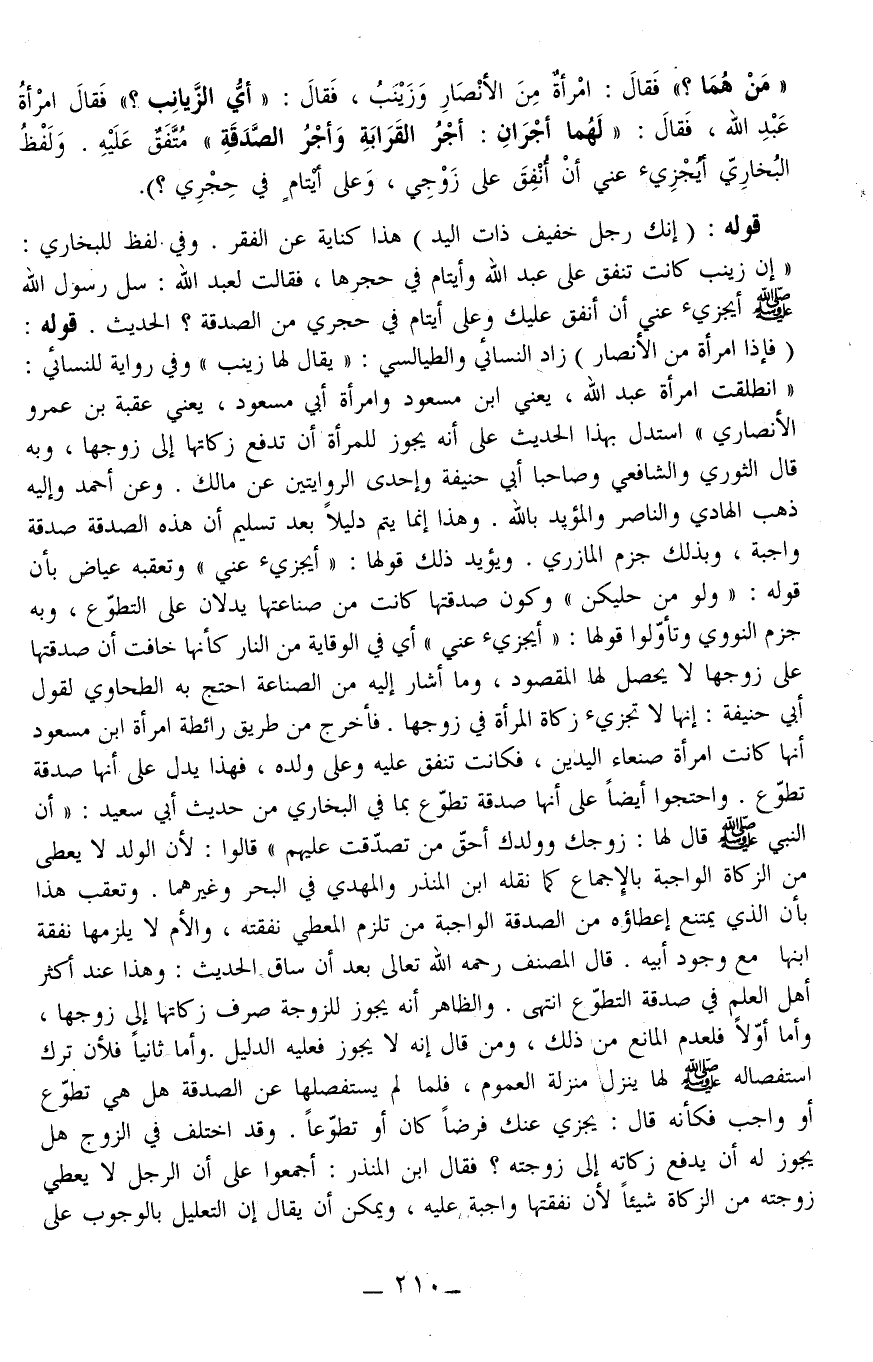 وَفِي لَفْظٍ لِلْبُخَارِيِّ: «إنَّ زَيْنَبَ كَانَتْ تُنْفِقُ عَلَى عَبْدِ اللَّهِ وَأَيْتَامٍ فِي حِجْرِهَا، فَقَالَتْ لِعَبْدِ اللَّهِ: سَلْ رَسُولَ اللَّهِ - صَلَّى اللَّهُ عَلَيْهِ وَسَلَّمَ - أَيُجْزِئُ عَنِّي أَنْ أُنْفِقَ عَلَيْكَ وَعَلَى أَيْتَامٍ فِي حِجْرِي مِنْ الصَّدَقَةِ» ؟ الْحَدِيثُ. قَوْلُهُ: (فَإِذَا امْرَأَةٌ مِنْ الْأَنْصَارِ) زَادَ النَّسَائِيّ وَالطَّيَالِسِيُّ " يُقَالُ لَهَا زَيْنَبُ " وَفِي رِوَايَةٍ لِلنَّسَائِيِّ: " انْطَلَقَتْ امْرَأَةُ عَبْدِ اللَّه، يَعْنِي ابْنَ مَسْعُودٍ وَامْرَأَةِ أَبِي مَسْعُودٍ، يَعْنِي عُقْبَةَ بْنَ عَمْرٍو الْأَنْصَارِيَّ " اُسْتُدِلَّ بِهَذَا الْحَدِيثِ عَلَى أَنَّهُ يَجُوزُ لِلْمَرْأَةِ أَنْ تَدْفَعَ زَكَاتَهَا إلَى زَوْجِهَا، وَبِهِ قَالَ الثَّوْرِيُّ وَالشَّافِعِيُّ وَصَاحِبَا أَبِي حَنِيفَةَ وَإِحْدَى الرِّوَايَتَيْنِ عَنْ مَالِكٍ. وَعَنْ أَحْمَدَ وَإِلَيْهِ ذَهَبَ الْهَادِي وَالنَّاصِرُ وَالْمُؤَيَّدُ بِاَللَّهِ