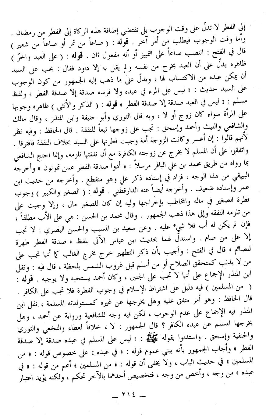 ـــــــــــــــــــــــــــــQإلَى الْفِطْرِ لَا تَدُلُّ عَلَى وَقْتِ الْوُجُوبِ بَلْ تَقْتَضِي إضَافَةَ هَذِهِ الزَّكَاةِ إلَى الْفِطْرِ مِنْ رَمَضَانَ. وَأَمَّا وَقْتُ الْوُجُوبِ فَيُطْلَبُ مِنْ أَمْرٍ آخَرَ. قَوْلُهُ: (صَاعًا مِنْ تَمْرٍ أَوْ صَاعًا مِنْ شَعِيرٍ) قَالَ فِي الْفَتْحِ: انْتَصَبَ صَاعًا عَلَى التَّمْيِيزِ أَوْ أَنَّهُ مَفْعُولٌ ثَانٍ. قَوْلُهُ: (عَلَى الْعَبْدِ وَالْحُرِّ) ظَاهِرُهُ يَدُلُّ عَلَى أَنَّ الْعَبْدَ يُخْرِجُ مِنْ نَفْسِهِ وَلَمْ يَقُلْ بِهِ إلَّا دَاوُد فَقَالَ: يَجِبُ عَلَى السَّيِّدِ أَنْ يُمَكِّنَ عَبْدَهُ مِنْ الِاكْتِسَابِ لَهَا، وَيَدُلُّ عَلَى مَا ذَهَبَ إلَيْهِ الْجُمْهُورُ مِنْ كَوْنِ الْوُجُوبِ عَلَى السَّيِّدِ حَدِيثُ: «لَيْسَ عَلَى الْمَرْءِ فِي عَبْدِهِ وَلَا فَرَسِهِ صَدَقَةٌ إلَّا صَدَقَةُ الْفِطْرِ» وَلَفْظُ مُسْلِمٍ: «لَيْسَ فِي الْعَبْدِ صَدَقَةٌ إلَّا صَدَقَةُ الْفِطْرِ»