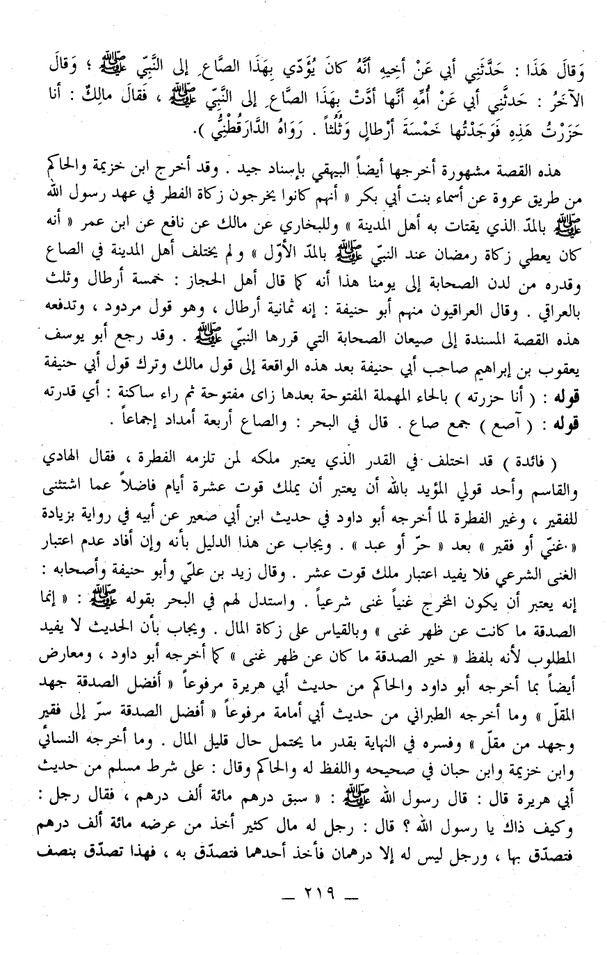ـــــــــــــــــــــــــــــQوَقَالَ هَذَا: حَدَّثَنِي أَبِي عَنْ أَخِيهِ أَنَّهُ كَانَ يُؤَدِّي بِهَذَا الصَّاعِ إلَى النَّبِيِّ - صَلَّى اللَّهُ عَلَيْهِ وَسَلَّمَ - وَقَالَ الْآخَرُ: حَدَّثَنِي أَبِي عَنْ أُمِّهِ أَنَّهَا أَدَّتْ بِهَذَا الصَّاعِ إلَى النَّبِيِّ - صَلَّى اللَّهُ عَلَيْهِ وَسَلَّمَ -، فَقَالَ مَالِكٌ: أَنَا حَزَرْتُ هَذِهِ فَوَجَدْتُهَا خَمْسَةَ أَرْطَالٍ وَثُلُثًا» . رَوَاهُ الدَّارَقُطْنِيّ) هَذِهِ الْقِصَّةُ مَشْهُورَةٌ أَخْرَجَهَا أَيْضًا الْبَيْهَقِيُّ بِإِسْنَادٍ جَيِّدٍ. وَقَدْ أَخْرَجَ ابْنُ خُزَيْمَةَ وَالْحَاكِمُ مِنْ طَرِيقِ عُرْوَةَ عَنْ أَسْمَاءَ بِنْتِ أَبِي بَكْرٍ «أَنَّهُمْ كَانُوا يُخْرِجُونَ زَكَاةَ الْفِطْرِ فِي عَهْدِ رَسُولِ اللَّهِ - صَلَّى اللَّهُ عَلَيْهِ وَسَلَّمَ - بِالْمُدِّ الَّذِي يَقْتَاتُ بِهِ أَهْلُ الْمَدِينَةِ» وَلِلْبُخَارِيِّ عَنْ مَالِكٍ عَنْ نَافِعٍ عَنْ ابْنِ عُمَرَ «أَنَّهُ كَانَ يُعْطِي زَكَاةَ رَمَضَانَ عِنْدَ النَّبِيِّ - صَلَّى اللَّهُ عَلَيْهِ وَسَلَّمَ - بِالْمُدِّ الْأَوَّلِ» وَلَمْ يَخْتَلِفْ أَهْلُ الْمَدِينَةِ فِي الصَّاعِ وَقَدْرِهِ مِنْ لَدُنْ الصَّحَابَةِ إلَى يَوْمِنَا هَذَا أَنَّهُ كَمَا قَالَ أَهْلُ الْحِجَازِ: خَمْسَةُ أَرْطَالٍ وَثُلُثٌ بِالْعِرَاقِيِّ. وَقَالَ الْعِرَاقِيُّونَ مِنْهُمْ أَبُو حَنِيفَةَ: إنَّهُ ثَمَانِيَةُ أَرْطَالٍ، وَهُوَ قَوْلٌ مَرْدُودٌ، وَتَدْفَعُهُ هَذِهِ الْقِصَّةُ الْمُسْنَدَةُ إلَى صِيعَانِ الصَّحَابَةِ الَّتِي قَرَّرَهَا النَّبِيُّ - صَلَّى اللَّهُ عَلَيْهِ وَسَلَّمَ -. وَقَدْ رَجَعَ أَبُو يُوسُفَ يَعْقُوبُ بْنُ إبْرَاهِيمَ صَاحِبُ أَبِي حَنِيفَةَ بَعْدَ هَذِهِ الْوَاقِعَةِ إلَى قَوْلِ مَالِكٍ وَتَرَكَ قَوْلَ أَبِي حَنِيفَةَ، قَوْلُهُ: (أَنَا حَزَرْتُهُ) بِالْحَاءِ الْمُهْمَلَةِ الْمَفْتُوحَةِ بَعْدَهَا زَايٌ مَفْتُوحَةٌ ثُمَّ رَاءٌ سَاكِنَةٌ: أَيْ قَدَّرْتُهُ قَوْلُهُ: (آصُعٌ) جَمْعُ صَاعٍ