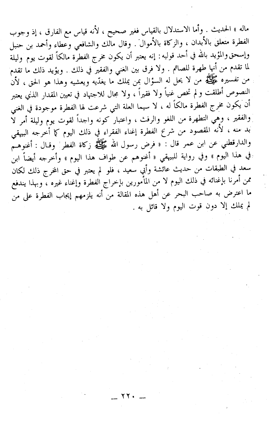 وَلَا فَرْقَ بَيْنَ الْغَنِيِّ وَالْفَقِيرِ فِي ذَلِكَ. وَيُؤَيِّدُ ذَلِكَ مَا تَقَدَّمَ مِنْ تَفْسِيرِهِ - صَلَّى اللَّهُ عَلَيْهِ وَسَلَّمَ - مَنْ لَا يَحِلُّ لَهُ السُّؤَالُ بِمَنْ يَمْلِكُ مَا يُغَدِّيهِ وَيُعَشِّيهِ وَهَذَا هُوَ الْحَقُّ؛ لِأَنَّ النُّصُوصَ أُطْلِقَتْ وَلَمْ تَخُصَّ غَنِيًّا وَلَا فَقِيرًا، وَلَا مَجَالَ لِلِاجْتِهَادِ فِي تَعْيِينِ الْمِقْدَارِ الَّذِي يُعْتَبَرُ أَنْ يَكُونَ مُخْرِجُ الْفِطْرَةِ مَالِكًا لَهُ، لَا سِيَّمَا الْعِلَّةُ الَّتِي شُرِعَتْ لَهَا الْفِطْرَةُ مَوْجُودَةٌ فِي الْغَنِيِّ وَالْفَقِيرِ، وَهِيَ التَّطْهِرَةُ مِنْ اللَّغْوِ وَالرَّفَثِ، وَاعْتِبَارُ كَوْنِهِ وَاجِدًا لِقُوتِ يَوْمٍ وَلَيْلَةٍ أَمْرٌ لَا بُدَّ مِنْهُ؛ لِأَنَّهُ الْمَقْصُودُ مِنْ شَرَعِ الْفِطْرَةِ إغْنَاءُ الْفُقَرَاءِ فِي ذَلِكَ الْيَوْمِ كَمَا أَخْرَجَهُ الْبَيْهَقِيُّ وَالدَّارَقُطْنِيّ عَنْ ابْنِ عُمَرَ قَالَ: «فَرَضَ رَسُولُ اللَّهِ - صَلَّى اللَّهُ عَلَيْهِ وَسَلَّمَ - زَكَاةَ الْفِطْرِ وَقَالَ: أَغْنُوهُمْ فِي هَذَا الْيَوْمِ» وَفِي رِوَايَةٍ لِلْبَيْهَقِيِّ " أَغْنُوهُمْ عَنْ طَوَافِ هَذَا الْيَوْمِ " وَأَخْرَجَهُ أَيْضًا ابْنُ سَعْدٍ فِي الطَّبَقَاتِ مِنْ حَدِيثِ عَائِشَةَ وَأَبِي سَعِيدٍ، فَلَوْ لَمْ يُعْتَبَرْ فِي حَقِّ الْمُخْرِجِ ذَلِكَ لَكَانَ مِمَّنْ أَمَرَنَا بِإِغْنَائِهِ فِي ذَلِكَ الْيَوْمِ لَا مِنْ الْمَأْمُورِينَ بِإِخْرَاجِ الْفِطْرَةِ وَإِغْنَاءِ غَيْرِهِ، وَبِهَذَا يَنْدَفِعُ مَا اعْتَرَضَ بِهِ صَاحِبُ الْبَحْرِ عَنْ أَهْلِ هَذِهِ الْمَقَالَةِ مِنْ أَنَّهُ يَلْزَمهُمْ إيجَابُ الْفِطْرَةِ عَلَى مَنْ لَمْ يَمْلِكْ إلَّا دُونَ قُوتِ الْيَوْمِ وَلَا قَائِلَ بِهِ.