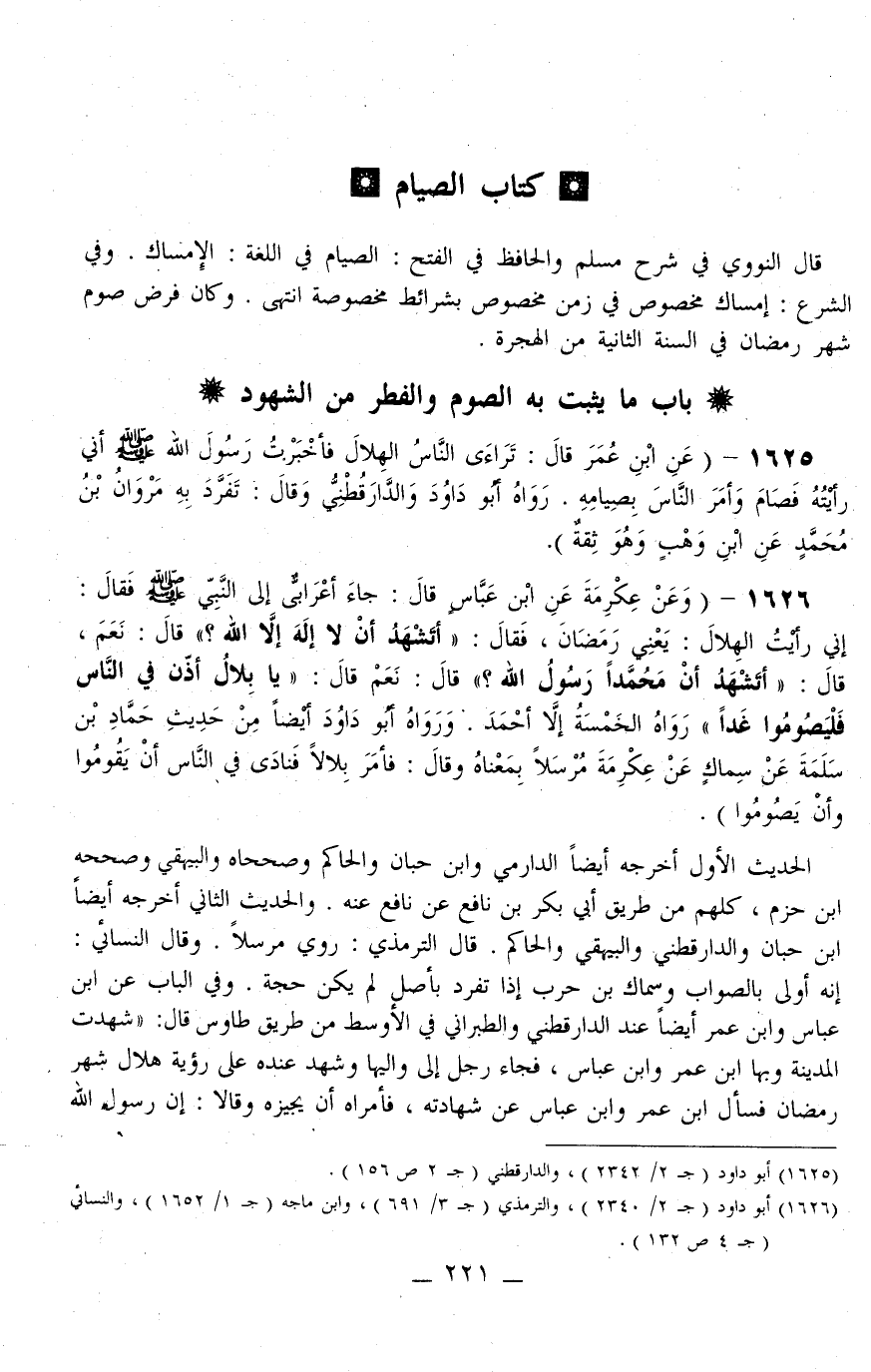 1626 - (وَعَنْ عِكْرِمَةَ عَنْ ابْنِ عَبَّاسٍ قَالَ: «جَاءَ أَعْرَابِيٌّ إلَى النَّبِيِّ - صَلَّى اللَّهُ عَلَيْهِ وَسَلَّمَ - فَقَالَ: إنِّي رَأَيْتُ الْهِلَالَ: يَعْنِي رَمَضَانَ فَقَالَ: أَتَشْهَدُ أَنْ لَا إلَهَ إلَّا اللَّهُ؟ قَالَ: نَعَمْ قَالَ: أَتَشْهَدُ أَنَّ مُحَمَّدًا رَسُولُ اللَّهِ؟ قَالَ: نَعَمْ قَالَ: يَا بِلَالُ أَذِّنْ فِي النَّاسِ فَلْيَصُومُوا غَدًا» رَوَاهُ الْخَمْسَةُ إلَّا أَحْمَدَ وَرَوَاهُ أَبُو دَاوُد أَيْضًا مِنْ حَدِيثِ حَمَّادِ بْنِ سَلَمَةَ عَنْ سِمَاكٍ عَنْ عِكْرِمَةَ مُرْسَلًا بِمَعْنَاهُ وَقَالَ: «فَأَمَرَ بِلَالًا فَنَادَى فِي النَّاسِ أَنْ يَقُومُوا وَأَنْ يَصُومُوا»