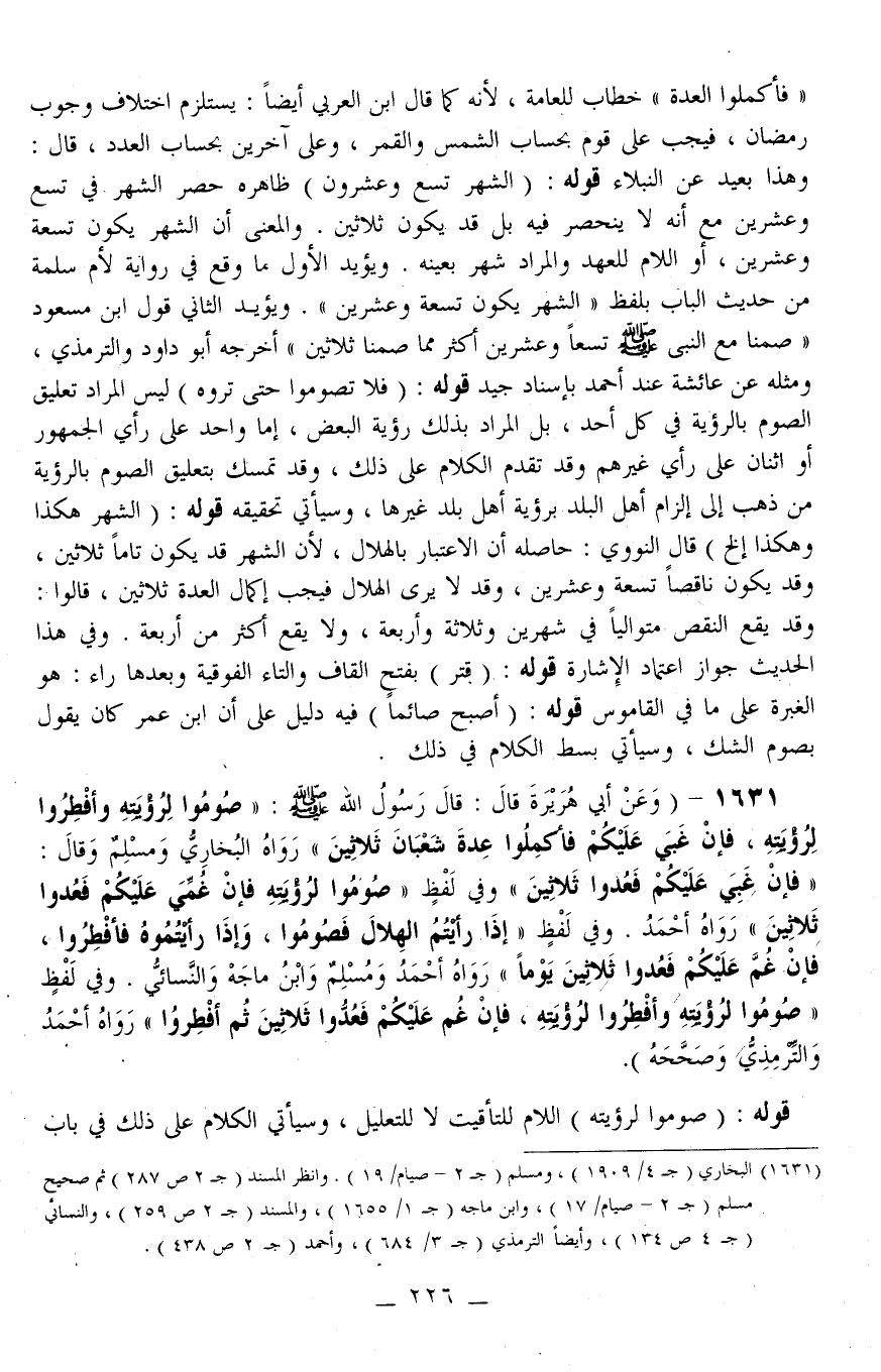 قَوْلُهُ.: (الشَّهْرُ تِسْعٌ وَعِشْرُونَ) ظَاهِرُهُ حَصْرُ الشَّهْرِ فِي تِسْعٍ وَعِشْرِينَ مَعَ أَنَّهُ لَا يَنْحَصِرُ فِيهِ بَلْ قَدْ يَكُونُ ثَلَاثِينَ. وَالْمَعْنَى أَنَّ الشَّهْرَ يَكُونُ تِسْعَةً وَعِشْرِينَ، أَوْ اللَّامُ لِلْعَهْدِ وَالْمُرَادُ شَهْرٌ بِعَيْنِهِ. وَيُؤَيِّدُ الْأَوَّلَ مَا وَقَعَ فِي رِوَايَةٍ لِأُمِّ سَلَمَةَ مِنْ حَدِيثِ الْبَابِ بِلَفْظِ «الشَّهْرُ يَكُونُ تِسْعَةً وَعِشْرِينَ» . وَيُؤَيِّدُ الثَّانِيَ قَوْلُ ابْنِ مَسْعُودٍ «صُمْنَا مَعَ النَّبِيِّ - صَلَّى اللَّهُ عَلَيْهِ وَسَلَّمَ - تِسْعًا وَعِشْرِينَ أَكْثَرُ مِمَّا صُمْنَا ثَلَاثِينَ» أَخْرَجَهُ أَبُو دَاوُد وَالتِّرْمِذِيُّ، وَمِثْلُهُ عَنْ عَائِشَةَ عِنْدَ أَحْمَدَ بِإِسْنَادٍ جَيِّدٍ. قَوْلُهُ: (فَلَا تَصُومُوا حَتَّى تَرَوْهُ) لَيْسَ الْمُرَادُ تَعْلِيقُ الصَّوْمِ بِالرُّؤْيَةِ فِي كُلِّ أَحَدٍ، بَلْ الْمُرَادُ بِذَلِكَ رُؤْيَةُ الْبَعْضِ، إمَّا وَاحِدٌ عَلَى رَأْيِ الْجُمْهُورِ أَوْ اثْنَانِ عَلَى رَأْيِ غَيْرِهِمْ وَقَدْ تَقَدَّمَ الْكَلَامُ عَلَى ذَلِكَ، وَقَدْ تَمَسَّكَ بِتَعْلِيقِ الصَّوْمِ بِالرُّؤْيَةِ مَنْ ذَهَبَ إلَى إلْزَامِ أَهْلِ الْبَلَدِ بِرُؤْيَةِ أَهْلِ بَلَدٍ غَيْرِهَا، وَسَيَأْتِي تَحْقِيقُهُ.