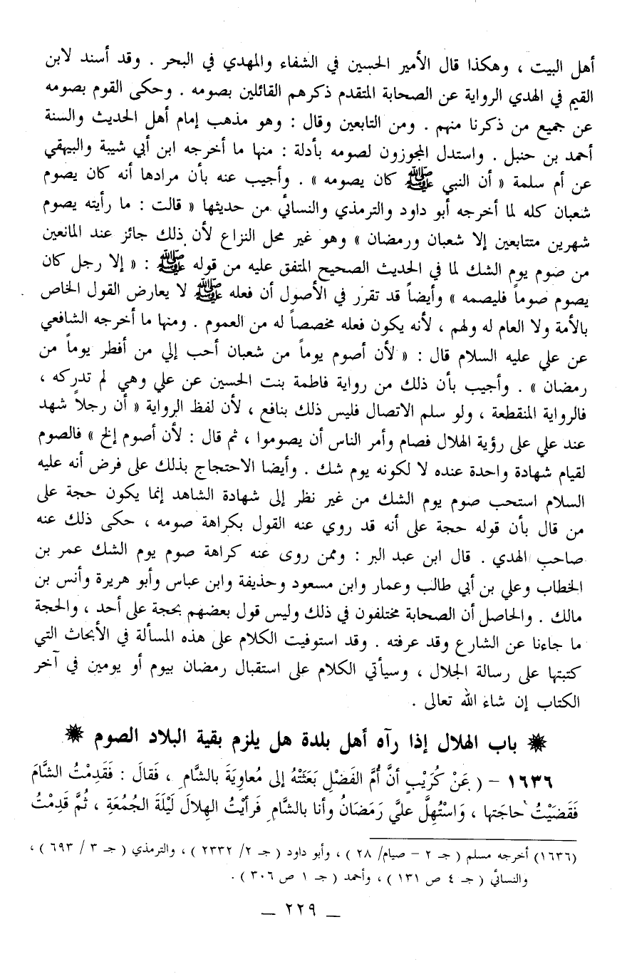 ـــــــــــــــــــــــــــــQأَهْلُ الْبَيْتِ، وَهَكَذَا قَالَ الْأَمِيرُ الْحُسَيْنُ فِي الشِّفَاءِ وَالْمَهْدِيُّ فِي الْبَحْرِ وَقَدْ أَسْنَدَ لِابْنِ الْقَيِّمِ فِي الْهَدْيِ الرِّوَايَةَ عَنْ الصَّحَابَةِ الْمُتَقَدِّمِ ذِكْرُهُمْ الْقَائِلِينَ بِصَوْمِهِ وَحَكَى الْقَوْمُ بِصَوْمِهِ عَنْ جَمِيعِ مَنْ ذَكَرْنَا مِنْهُمْ وَمِنْ التَّابِعِينَ وَقَالَ: وَهُوَ مَذْهَبُ إمَامِ أَهْلِ الْحَدِيثِ وَالسُّنَّةِ أَحْمَدُ بْنُ حَنْبَلٍ وَاسْتَدَلَّ الْمُجَوِّزُونَ لِصَوْمِهِ بِأَدِلَّةٍ: مِنْهَا مَا أَخْرَجَهُ ابْنُ أَبِي شَيْبَةَ وَالْبَيْهَقِيُّ عَنْ أُمِّ سَلَمَةَ «أَنَّ النَّبِيَّ - صَلَّى اللَّهُ عَلَيْهِ وَسَلَّمَ - كَانَ يَصُومُهُ» وَأُجِيبَ عَنْهُ بِأَنَّ مُرَادَهَا أَنَّهُ كَانَ يَصُومُ شَعْبَانَ كُلَّهُ لِمَا أَخْرَجَهُ أَبُو دَاوُد وَالتِّرْمِذِيُّ وَالنَّسَائِيُّ مِنْ حَدِيثِهَا قَالَتْ «مَا رَأَيْتُهُ يَصُومُ شَهْرَيْنِ مُتَتَابِعَيْنِ إلَّا شَعْبَانَ وَرَمَضَانَ» وَهُوَ غَيْرُ مَحَلِّ النِّزَاعِ لِأَنَّ ذَلِكَ جَائِزٌ عِنْدَ الْمَانِعِينَ مِنْ صَوْمِ يَوْمِ الشَّكِّ لِمَا فِي الْحَدِيثِ الصَّحِيحِ الْمُتَّفَقِ عَلَيْهِ مِنْ قَوْلِهِ - صَلَّى اللَّهُ عَلَيْهِ وَسَلَّمَ -: «إلَّا رَجُلٌ كَانَ يَصُومُ صَوْمًا فَلْيَصُمْهُ» .