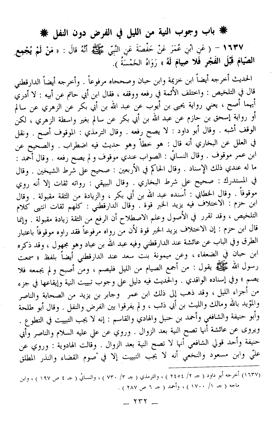 1637 - (عَنْ ابْنِ عُمَرَ عَنْ حَفْصَةَ عَنْ النَّبِيِّ - صَلَّى اللَّهُ عَلَيْهِ وَسَلَّمَ - أَنَّهُ قَالَ: «مَنْ لَمْ يَجْمَعْ الصِّيَامَ قَبْلَ الْفَجْرِ فَلَا صِيَامَ لَهُ» رَوَاهُ الْخَمْسَةُ)
