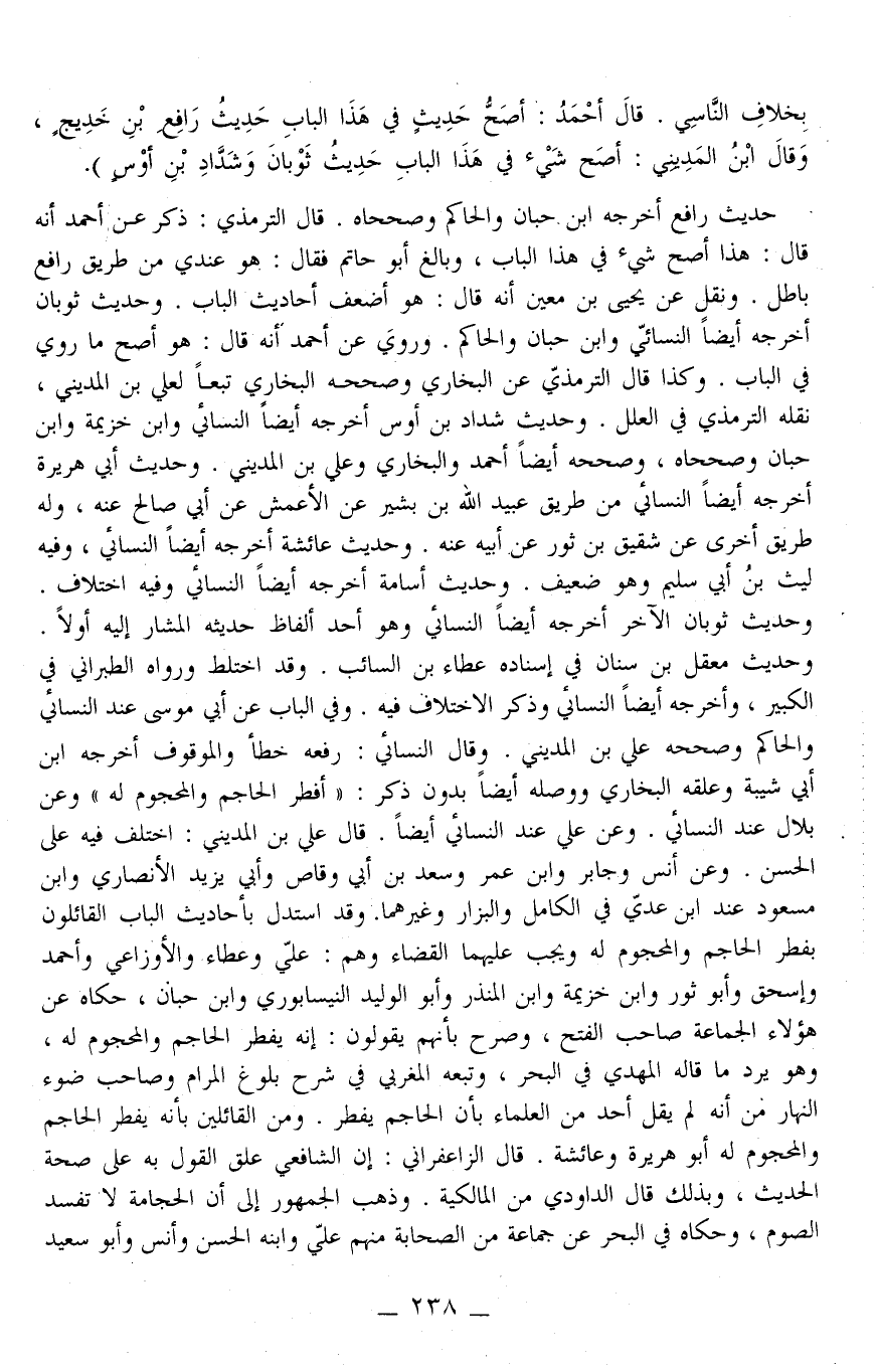 بِخِلَافِ النَّاسِي. قَالَ أَحْمَدُ: أَصَحُّ حَدِيثٍ فِي هَذَا الْبَابِ حَدِيثُ رَافِعِ بْنِ خَدِيجٍ، وَقَالَ ابْنُ الْمَدِينِيِّ: أَصَحُّ شَيْءٍ فِي هَذَا الْبَابِ حَدِيثُ ثَوْبَانَ وَشَدَّادِ بْنِ أَوْسٍ) .