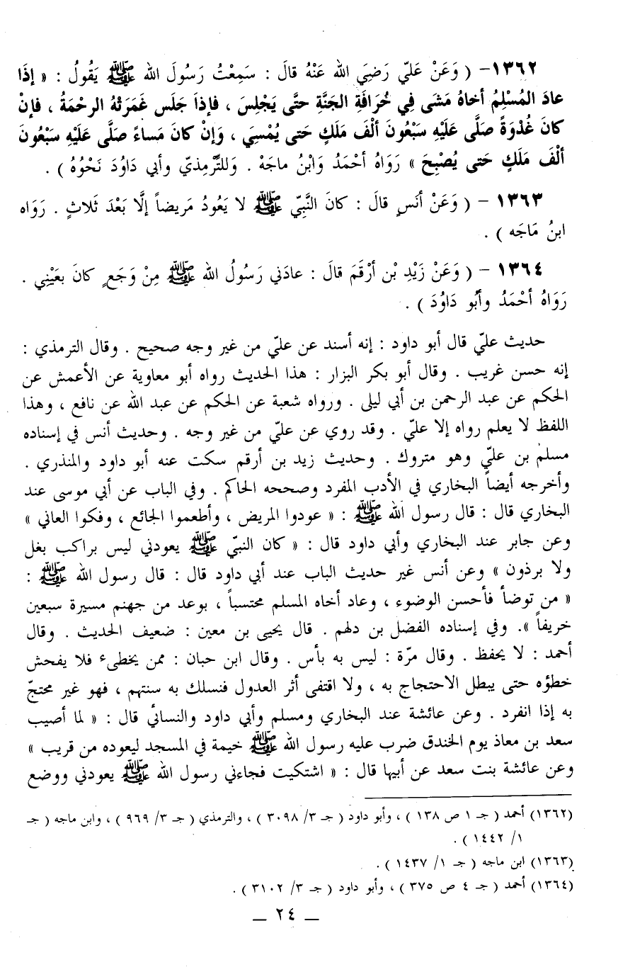 1364 - (وَعَنْ زَيْدِ بْنِ أَرْقَمَ قَالَ: «عَادَنِي رَسُولُ اللَّهِ - صَلَّى اللَّهُ عَلَيْهِ وَسَلَّمَ - مِنْ وَجَعٍ كَانَ بِعَيْنِي» رَوَاهُ أَحْمَدُ وَأَبُو دَاوُد) .