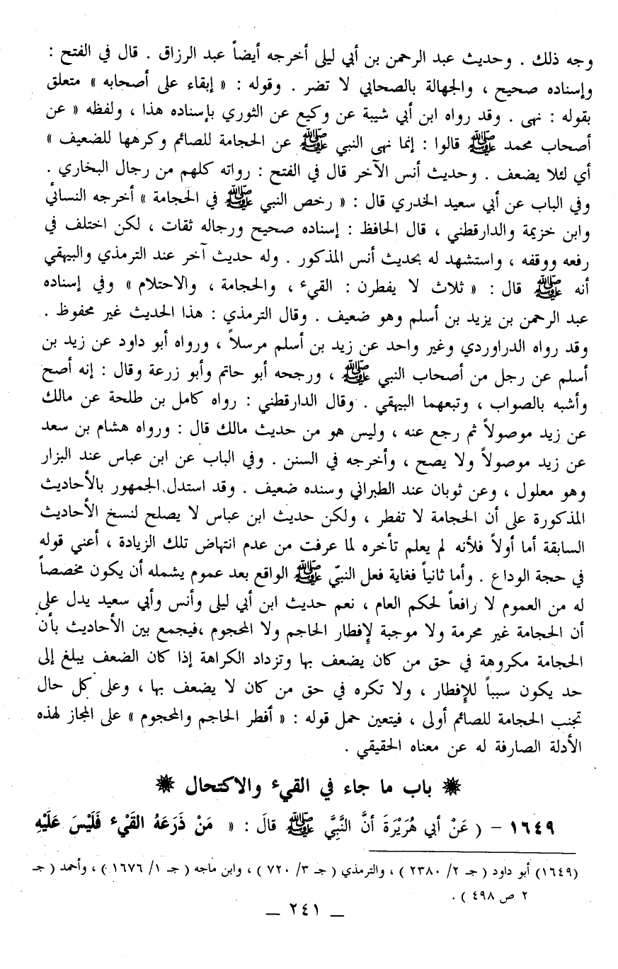 1649 - (عَنْ أَبِي هُرَيْرَةَ أَنَّ النَّبِيَّ - صَلَّى اللَّهُ عَلَيْهِ وَسَلَّمَ - قَالَ: «مَنْ ذَرَعَهُ الْقَيْءُ فَلَيْسَ عَلَيْهِ