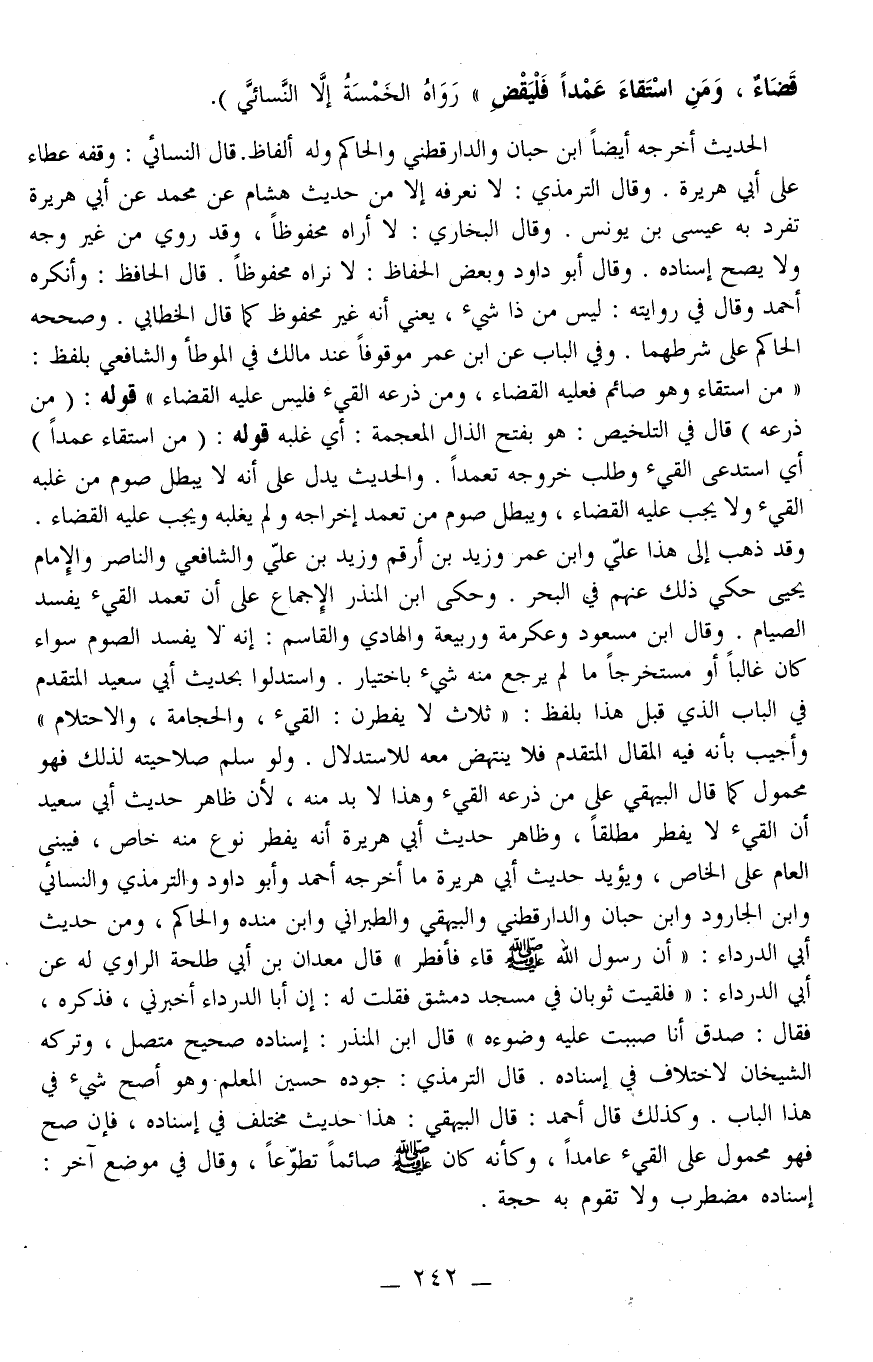 وَلَوْ سُلِّمَ صَلَاحِيَّتُهُ لِذَلِكَ فَهُوَ مَحْمُولٌ كَمَا قَالَ الْبَيْهَقِيُّ عَلَى مَنْ ذَرَعَهُ الْقَيْءُ وَهَذَا لَا بُدَّ مِنْهُ؛ لِأَنَّ ظَاهِرَ حَدِيثِ أَبِي سَعِيدٍ أَنَّ الْقَيْءَ لَا يُفْطِرُ مُطْلَقًا، وَظَاهِرُ حَدِيثِ أَبِي هُرَيْرَةَ أَنَّهُ يُفْطِرُ نَوْعٌ مِنْهُ خَاصٌّ، فَيُبْنَى الْعَامُّ عَلَى الْخَاصِّ، وَيُؤَيِّدُ حَدِيثَ أَبِي هُرَيْرَةَ مَا أَخْرَجَهُ أَحْمَدُ وَأَبُو دَاوُد وَالتِّرْمِذِيُّ وَالنَّسَائِيُّ وَابْنُ الْجَارُودِ وَابْنُ حِبَّانَ وَالدَّارَقُطْنِيّ وَالْبَيْهَقِيُّ وَالطَّبَرَانِيُّ وَابْنُ مَنْدَهْ وَالْحَاكِمُ، وَمِنْ حَدِيثِ أَبِي الدَّرْدَاءِ: «أَنَّ رَسُولَ اللَّهِ - صَلَّى اللَّهُ عَلَيْهِ وَسَلَّمَ - قَاءَ فَأَفْطَرَ» قَالَ مَعْدَانُ بْنُ أَبِي طَلْحَةَ الرَّاوِي لَهُ عَنْ أَبِي الدَّرْدَاءِ: " فَلَقِيتُ ثَوْبَانَ فِي مَسْجِدِ دِمَشْقَ فَقُلْتُ لَهُ: إنَّ أَبَا الدَّرْدَاءِ أَخْبَرَنِي، فَذَكَرَهُ، فَقَالَ: صَدَقَ أَنَا صَبَبْتُ عَلَيْهِ وَضُوءَهُ " قَالَ ابْنُ الْمُنْذِرِ: إسْنَادُهُ صَحِيحٌ مُتَّصِلٌ، وَتَرَكَهُ الشَّيْخَانِ لَاخْتِلَافٍ فِي إسْنَادِهِ. قَالَ التِّرْمِذِيُّ: جَوَّدَهُ حُسَيْنٌ الْمُعَلِّمُ وَهُوَ أَصَحُّ شَيْءٍ فِي هَذَا الْبَابِ. وَكَذَلِكَ قَالَ أَحْمَدُ: قَالَ الْبَيْهَقِيُّ: هَذَا حَدِيثٌ مُخْتَلَفٌ فِي إسْنَادِهِ، فَإِنْ صَحَّ فَهُوَ مَحْمُولٌ عَلَى الْقَيْءِ عَامِدًا، وَكَأَنَّهُ كَانَ - صَلَّى اللَّهُ عَلَيْهِ وَسَلَّمَ - صَائِمًا تَطَوُّعًا، وَقَالَ فِي مَوْضِعٍ آخَرَ إسْنَادُهُ مُضْطَرِبٌ وَلَا تَقُومُ بِهِ حُجَّةٌ..