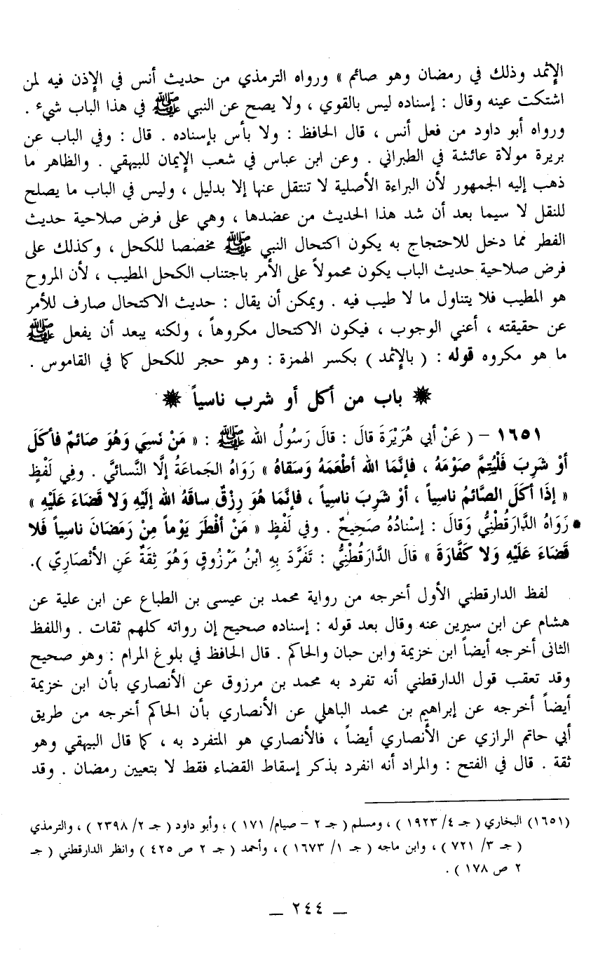 1651 - (عَنْ أَبِي هُرَيْرَةَ قَالَ: قَالَ رَسُولُ اللَّهِ - صَلَّى اللَّهُ عَلَيْهِ وَسَلَّمَ -: «مَنْ نَسِيَ وَهُوَ صَائِمٌ فَأَكَلَ أَوْ شَرِبَ فَلْيُتِمَّ صَوْمَهُ، فَإِنَّمَا اللَّهُ أَطْعَمَهُ وَسَقَاهُ» رَوَاهُ الْجَمَاعَةُ إلَّا النَّسَائِيّ.