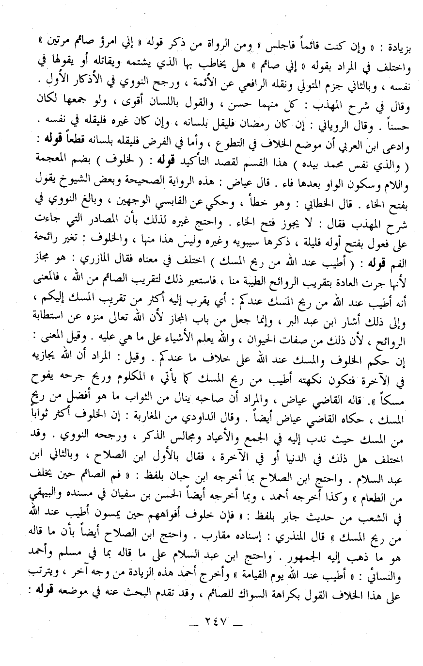 وَقَالَ الرُّويَانِيُّ: إنْ كَانَ رَمَضَانُ فَلْيَقُلْ بِلِسَانِهِ، وَإِنْ كَانَ غَيْرُهُ فَلْيَقُلْهُ فِي نَفْسِهِ. وَادَّعَى ابْنُ الْعَرَبِيِّ أَنَّ مَوْضِعَ الْخِلَافِ فِي التَّطَوُّعِ، وَأَمَّا فِي الْفَرْضِ فَلْيَقُلْهُ بِلِسَانِهِ قَطْعًا. قَوْلُهُ: (وَاَلَّذِي نَفْسُ مُحَمَّدٍ بِيَدِهِ) هَذَا الْقَسَمُ لِقَصْدِ التَّأْكِيدِ. قَوْلُهُ: (لَخُلُوفُ) بِضَمِّ الْمُعْجَمَةِ وَاللَّامِ وَسُكُونِ الْوَاوِ بَعْدَهَا فَاءٌ. قَالَ عِيَاضٌ: هَذِهِ الرِّوَايَةُ الصَّحِيحَةُ وَبَعْضُ الشُّيُوخِ يَقُولُ بِفَتْحِ الْخَاءِ. قَالَ الْخَطَّابِيِّ: وَهُوَ خَطَأٌ، وَحُكِيَ عَنْ الْقَابِسِيِّ الْوَجْهَيْنِ، وَبَالَغَ النَّوَوِيُّ فِي شَرْحِ الْمُهَذَّبِ فَقَالَ: لَا يَجُوزُ فَتْحُ الْخَاءِ. وَاحْتَجَّ غَيْرُهُ لِذَلِكَ بِأَنَّ الْمَصَادِرَ الَّتِي جَاءَتْ عَلَى فَعُولٍ بِفَتْحِ أَوْلِهِ قَلِيلَةٍ، ذَكَرَهَا سِيبَوَيْهِ وَغَيْرُهُ. وَلَيْسَ هَذَا مِنْهَا، وَالْخُلُوفُ: تَغَيُّرُ رَائِحَةِ الْفَمِّ قَوْلُهُ: (أَطْيَبُ عِنْدَ اللَّهِ مِنْ رِيحِ الْمِسْكِ) اُخْتُلِفَ فِي مَعْنَاهُ فَقَالَ الْمَازِرِيُّ: هُوَ مَجَازٌ لِأَنَّهَا جَرَتْ الْعَادَةُ بِتَقْرِيبِ الرَّوَائِحِ الطَّيِّبَةِ مِنَّا، فَاسْتُعِيرَ ذَلِكَ لِتَقْرِيبِ الصَّائِمِ مِنْ اللَّهِ، فَالْمَعْنَى أَنَّهُ أَطْيَبُ عِنْدَ اللَّهِ مِنْ رِيحِ الْمِسْكِ عِنْدَكُمْ: أَيْ يَقْرَبُ إلَيْهِ أَكْثَرَ مِنْ تَقْرِيبِ الْمِسْكِ إلَيْكُمْ، وَإِلَى ذَلِكَ أَشَارَ ابْنُ عَبْدِ الْبَرِّ، وَإِنَّمَا جُعِلَ مِنْ بَابِ الْمَجَازِ لِأَنَّ اللَّهَ - تَعَالَى - مُنَزَّهٌ عَنْ اسْتِطَابَةِ الرَّوَائِحِ، لِأَنَّ ذَلِكَ مِنْ صِفَاتِ الْحَيَوَانِ، وَاَللَّهُ يَعْلَمُ الْأَشْيَاءَ عَلَى مَا هِيَ عَلَيْهِ.
