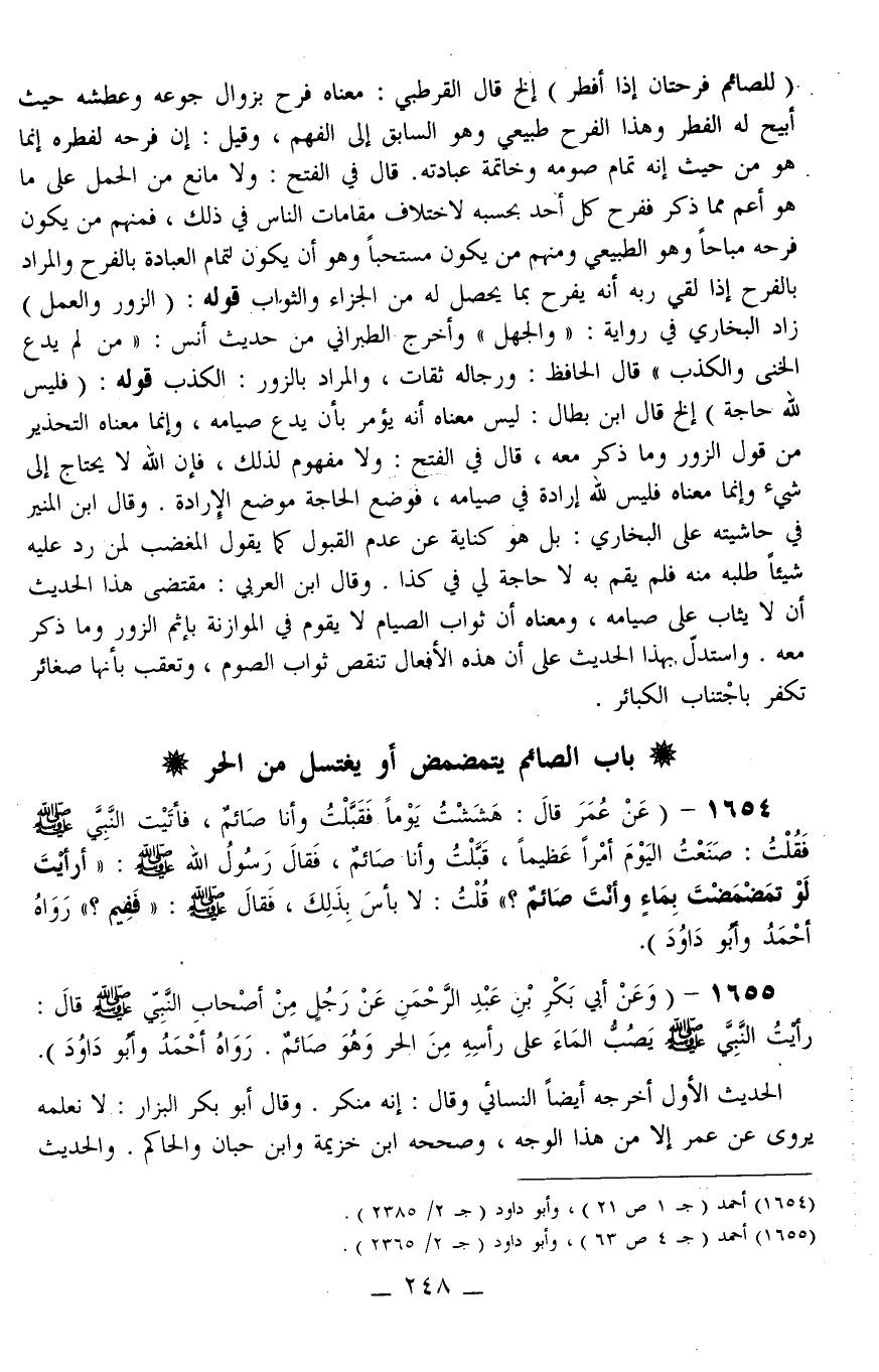 1654 - (عَنْ عُمَرَ قَالَ: «هَشَشْتُ يَوْمًا فَقَبَّلْتُ وَأَنَا صَائِمٌ، فَأَتَيْتُ النَّبِيَّ - صَلَّى اللَّهُ عَلَيْهِ وَسَلَّمَ - فَقُلْتُ صَنَعْتُ الْيَوْمَ أَمْرًا عَظِيمًا، قَبَّلْتُ وَأَنَا صَائِمٌ، فَقَالَ رَسُولُ اللَّهِ - صَلَّى اللَّهُ عَلَيْهِ وَسَلَّمَ -: أَرَأَيْتَ لَوْ تَمَضْمَضْتَ بِمَاءٍ وَأَنْتَ صَائِمٌ؟ قُلْتُ: لَا بَأْسَ بِذَلِكَ، فَقَالَ: فَفِيمَ» ؟ رَوَاهُ أَحْمَدُ وَأَبُو دَاوُد) .