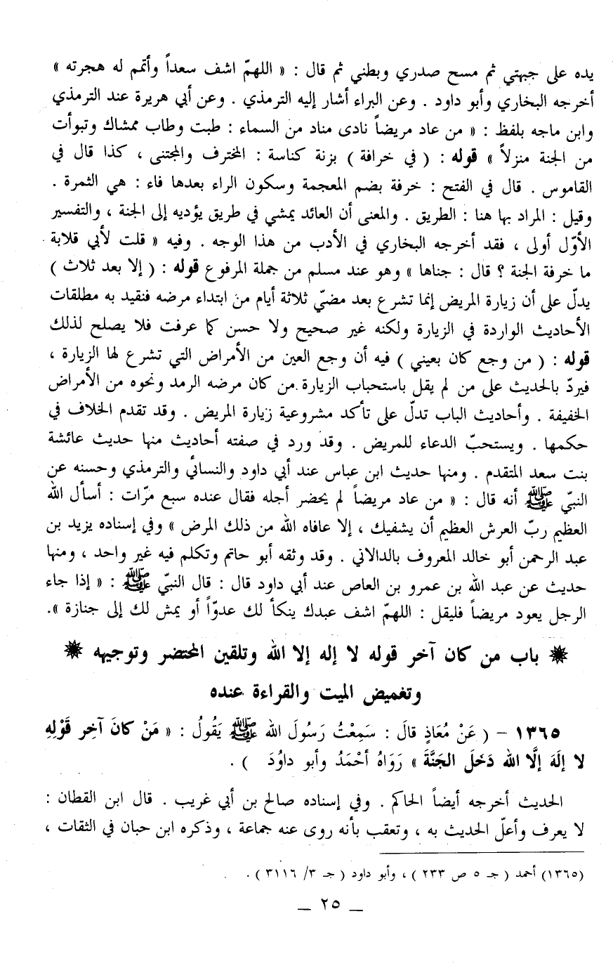 1365 - (عَنْ مُعَاذٍ قَالَ: سَمِعْتُ رَسُولَ اللَّهِ - صَلَّى اللَّهُ عَلَيْهِ وَسَلَّمَ - يَقُولُ: «مَنْ كَانَ آخِرُ قَوْلِهِ لَا إلَهَ إلَّا اللَّهُ دَخَلَ الْجَنَّةَ» رَوَاهُ أَحْمَدُ وَأَبُو دَاوُد)