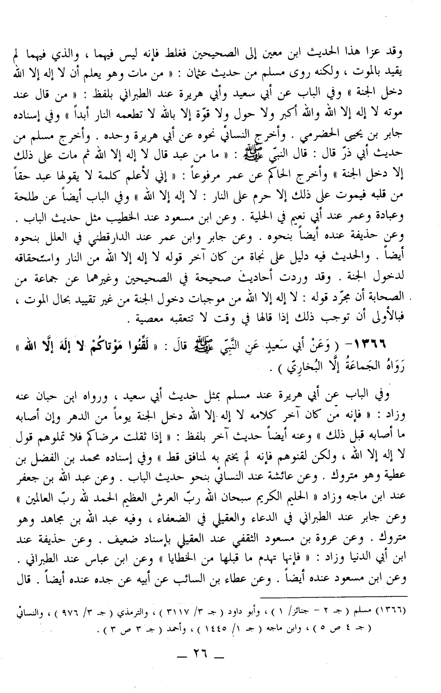 1366 - (وَعَنْ أَبِي سَعِيدٍ عَنْ النَّبِيِّ - صَلَّى اللَّهُ عَلَيْهِ وَسَلَّمَ - قَالَ: «لَقِّنُوا مَوْتَاكُمْ لَا إلَهَ إلَّا اللَّهُ» رَوَاهُ الْجَمَاعَةُ إلَّا الْبُخَارِيَّ)